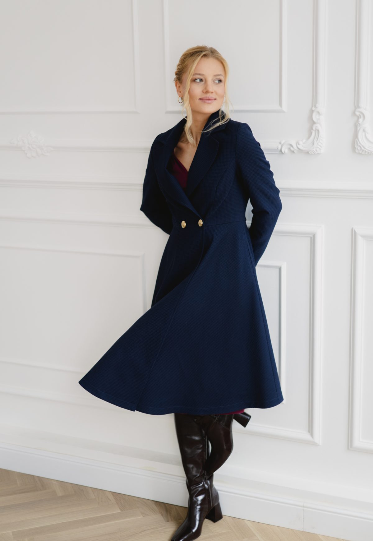 Płaszcz Alexsandre ma taliowany krój i dół szyty z koła, który pięknie podkreśla sylwetkę. Dwurzędowe zapięcie na złote guziki nadaje mu ponadczasowego charakteru, a głęboki granatowy kolor sprawia, że łatwo dopasujesz go do różnych stylizacji. Wykonany z wysokiej jakości tkaniny o delikatnej strukturze, jest miękki i przyjemny w dotyku oraz dobrze trzyma formę.