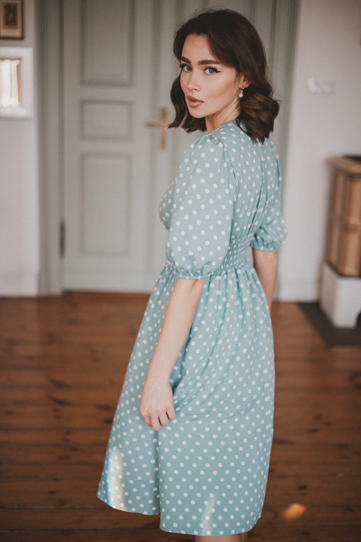 Aline mint dessert uszyliśmy z delikatnej tkaniny wiskozowej w grochy. Aby zwiększyć komfort noszenia, w dół spódnicy wszyliśmy podszewkę z bawełny soft. Sukienka posiada szeroki pas, który optycznie zwęża talię i podnosi biust. Sukienka jednocześnie świetnie leży w okolicy talii i jest wygodna za sprawą rzędu gumowych nici, które zlokalizowaliśmy z tyłu sukienki. Rozwiązanie to idealnie sprawdzi się na co dzień, gdy podczas codziennych zajęć wygoda jest dla nas równie ważna co estetyczny wygląd.