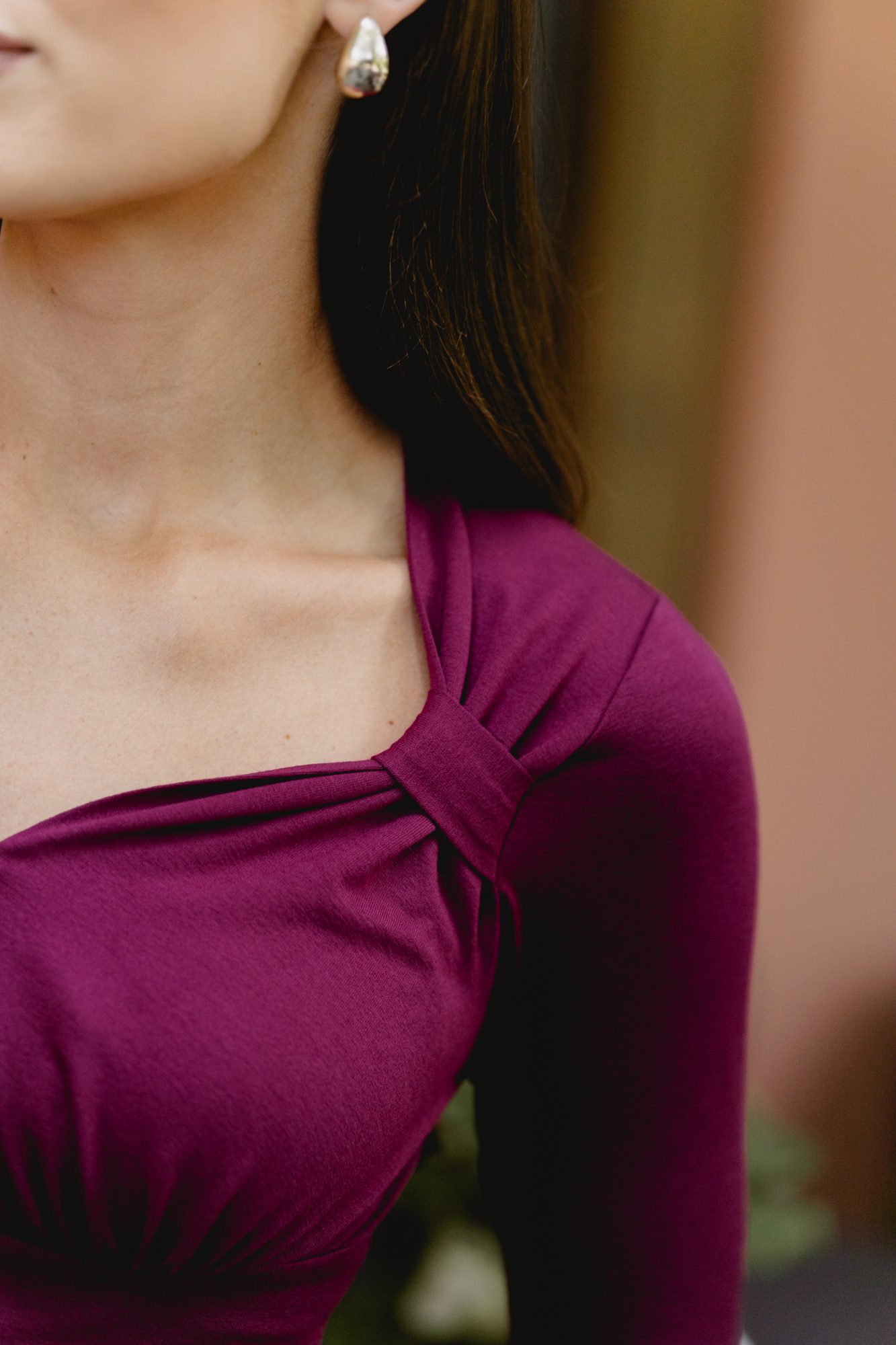 Dekolt w kształcie litery „V” z delikatnym marszczeniem pięknie podkreśla biust i wysmukla szyję, a przemyślane cięcia w górnej części dodają wyjątkowego charakteru. Długie, dopasowane rękawy sprawiają, że Carla to model ponadczasowy i niezwykle uniwersalny.
