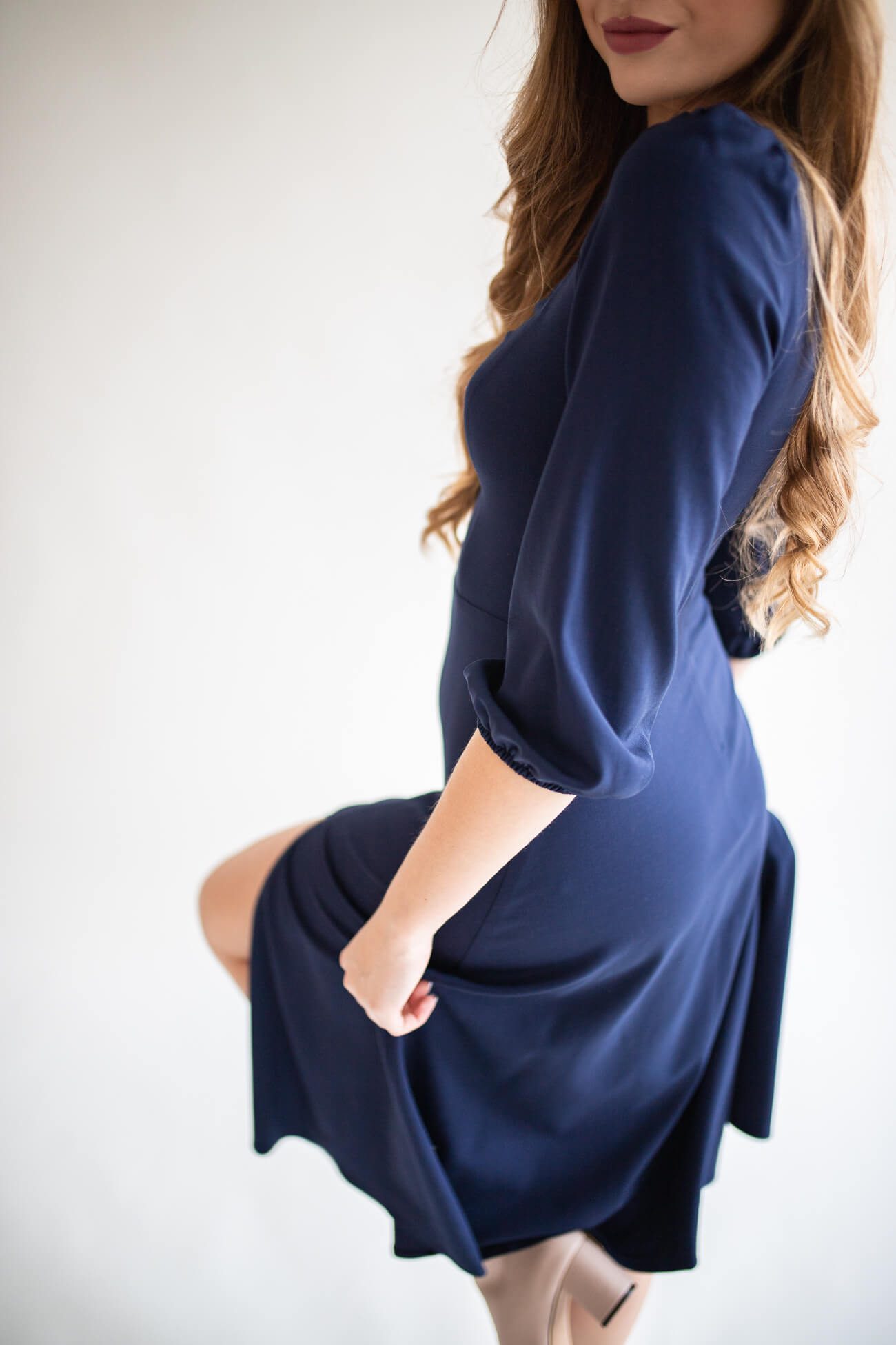 Clementine to elegancka sukienka z dekoltem „w serce”. Ten typ dekoltu wspaniale podkreśla biust, bez względu na to, jaki rozmiar miseczki nosisz. Dół spódnicy uszyliśmy z pół koła, dzięki czemu spódnica wspaniale układa się podczas ruchu. Rozcięcie dodaje sukience elegancji i kobiecości. Clementine uszyliśmy z bardzo wdzięcznej wiskozy z domieszką elastanu. Materiał „pracuje” i dopasowuje się do sylwetki. Wiskoza jest grubsza niż ta, z której powstaje większość sukienek letnich. Dzięki temu materiał nie prześwituje, nie mnie się i cudownie „pracuje” na ciele.