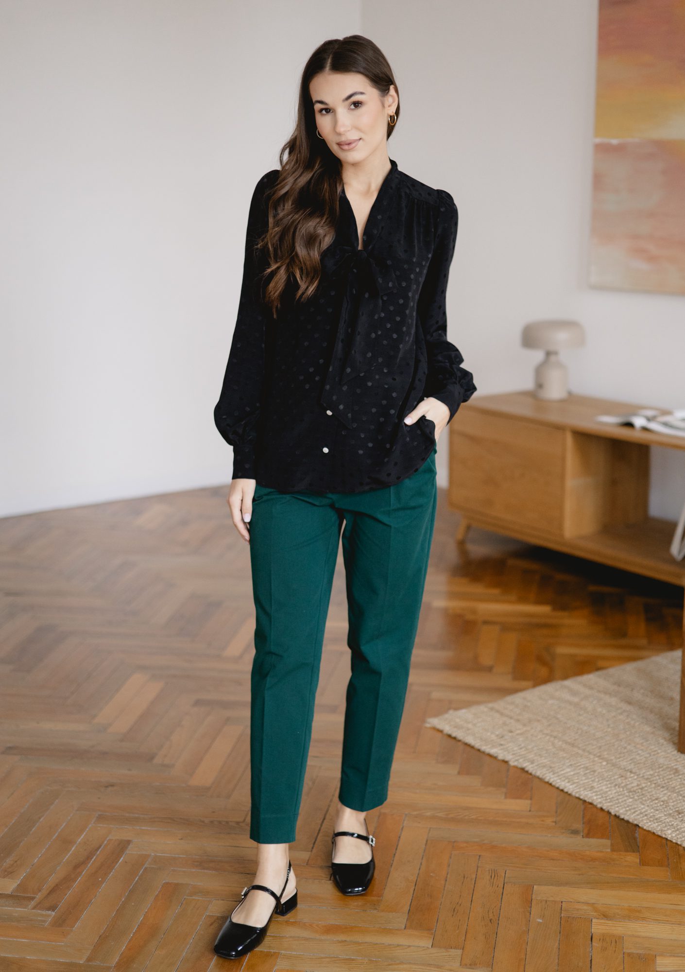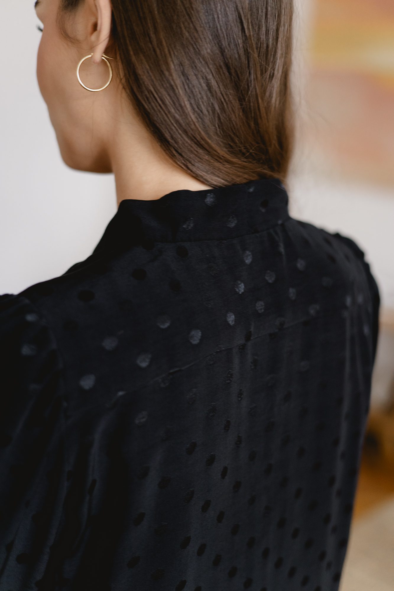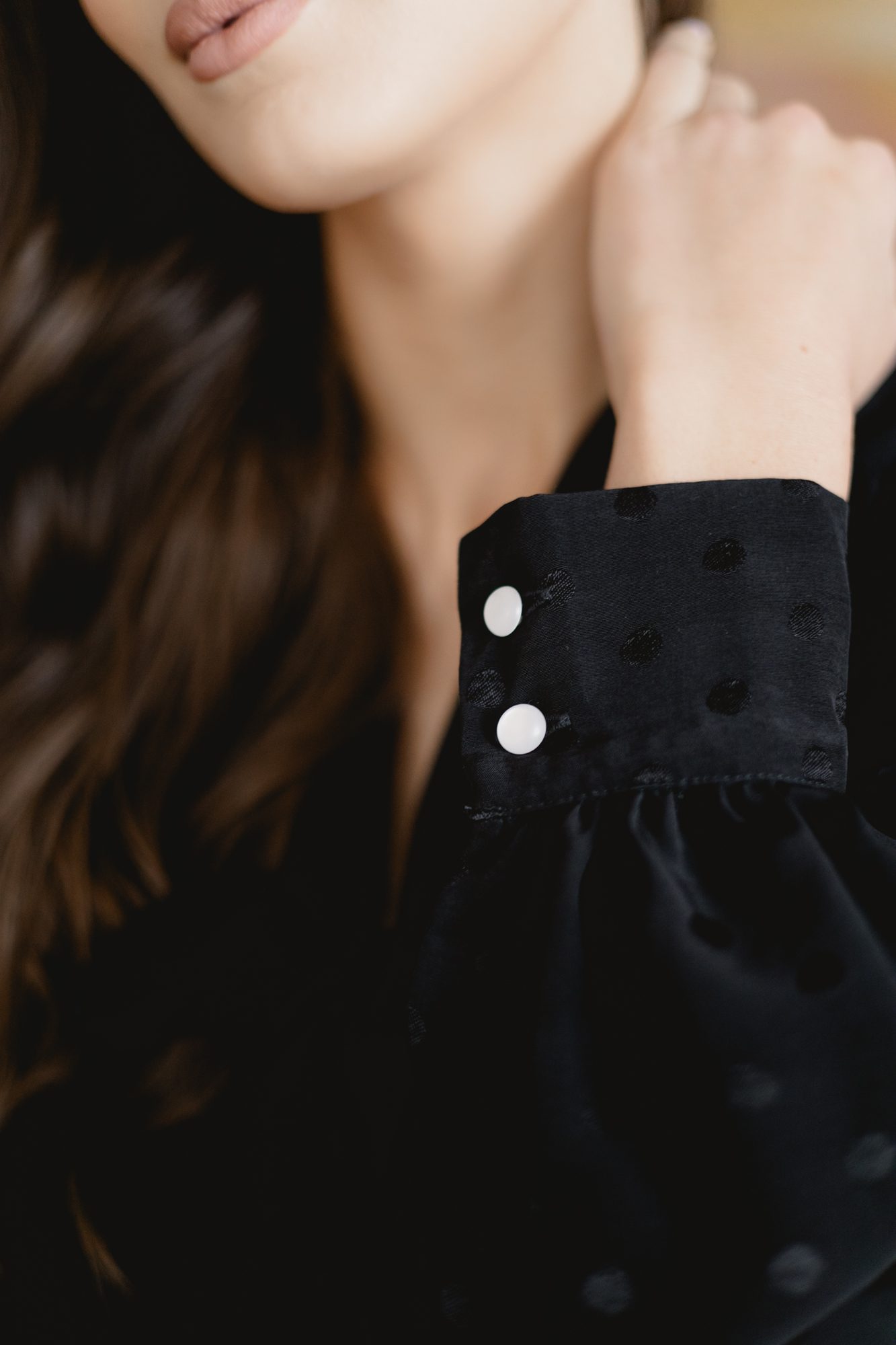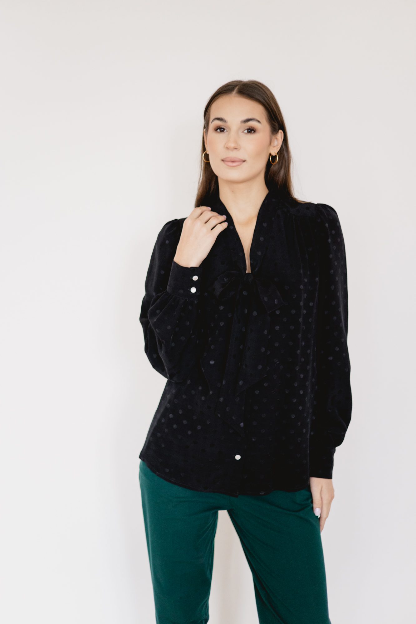 Anabel to klasyczna koszula zapinana na guziki. Uszyliśmy ją z tkaniny wiskozowej w tłoczony wzór. Tłoczone grochy wspaniale współgrają ze światłem, dodając koszuli odrobinę blasku i elegancji. Koszula posiada szarfę, którą można przewiązać w węzeł lub kokardę. Anabel posiada szerokie rękawy zebrane w mankiet. Swobodny fason pasuje zarówno do spodni, jak i spódnic. Świetnie wygląda zarówno wpuszczona w środek spódnicy, jak i spuszczona wolno na zewnątrz.