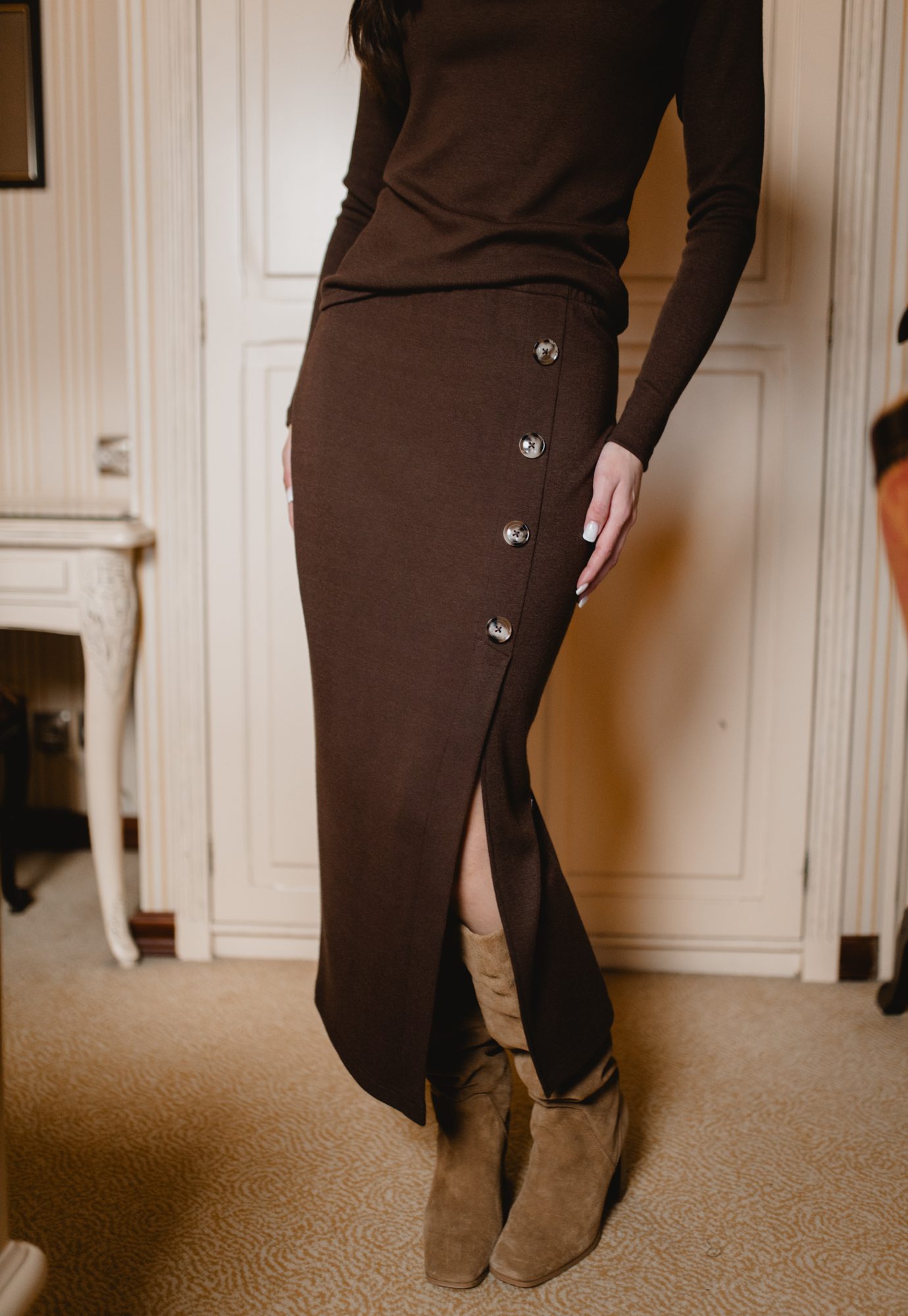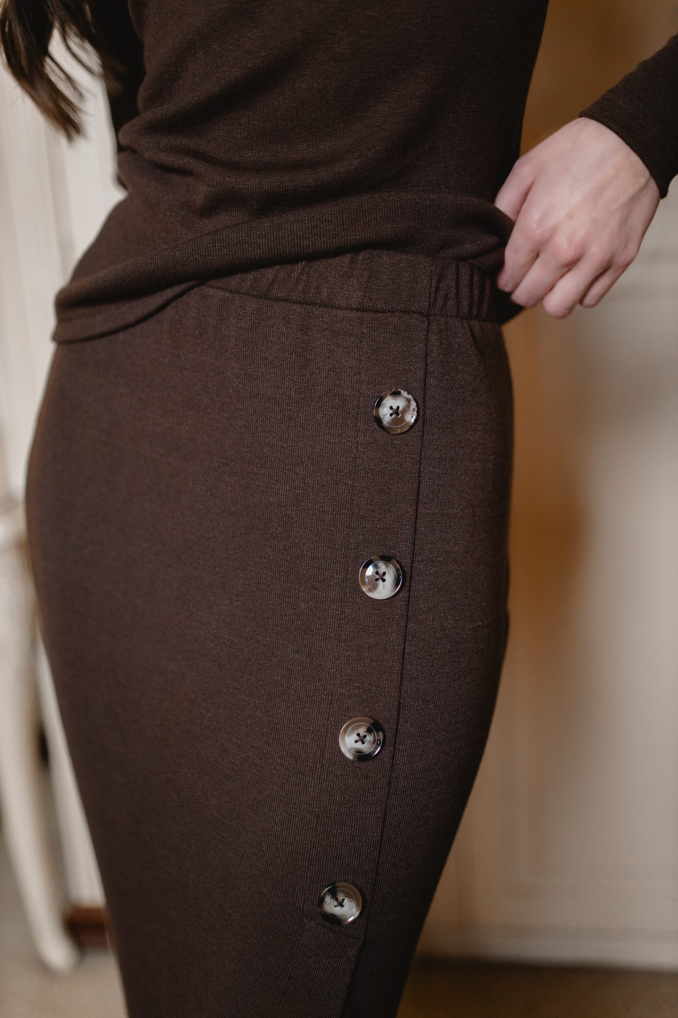 Spódnica Thea to elegancki, dzianinowy model o długości midi, idealny na jesień i zimę. Pionowy rząd guzików oraz zmysłowe rozcięcie pięknie podkreślają sylwetkę, dodając lekkości i nowoczesnego charakteru. Elastyczny pas zapewnia wygodę noszenia, a stonowany chłodny odcień zieleni świetnie łączy się z kozakami, swetrami i klasycznymi topami. Doskonała do codziennych, biurowych i wieczornych stylizacji.