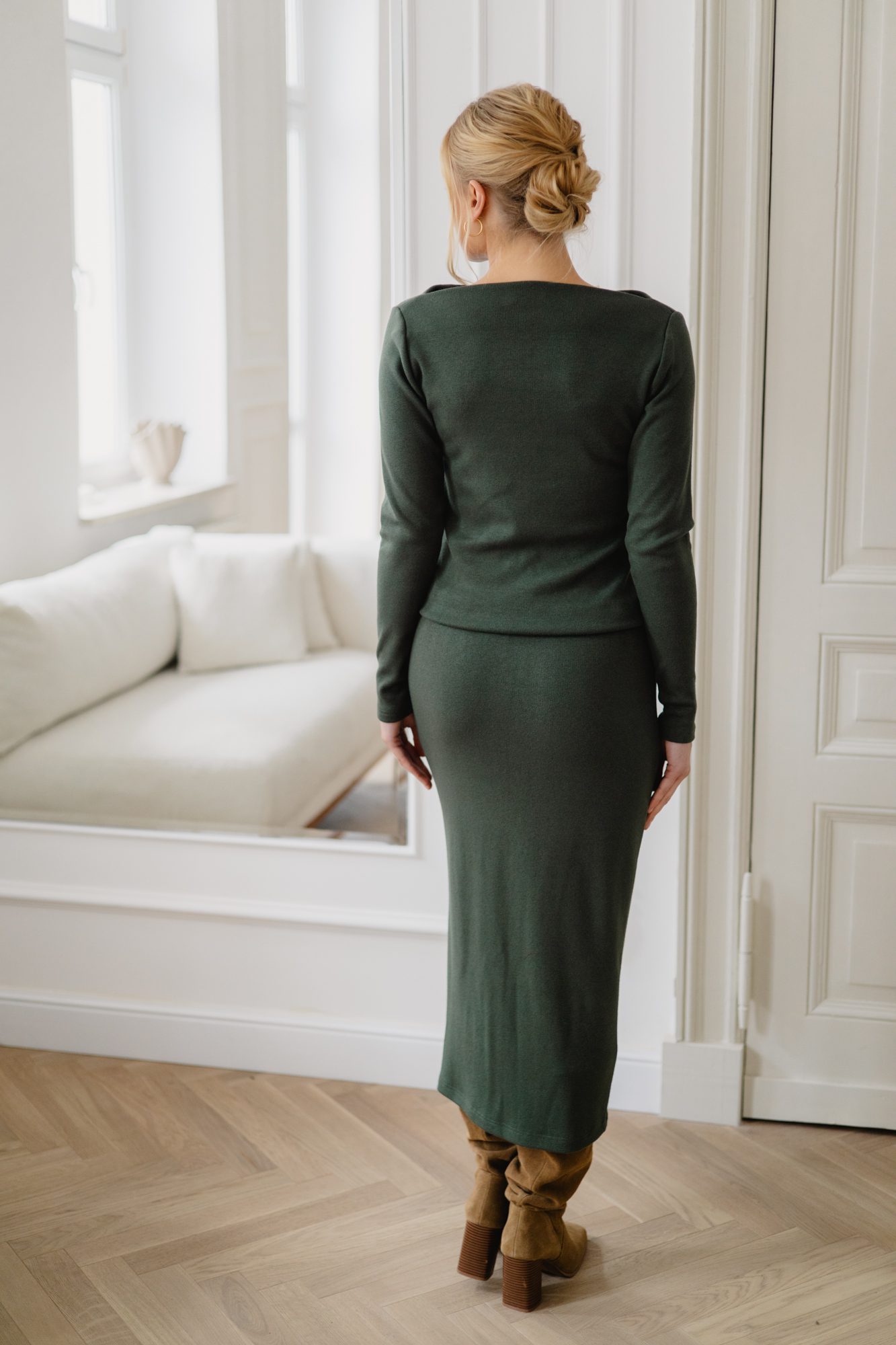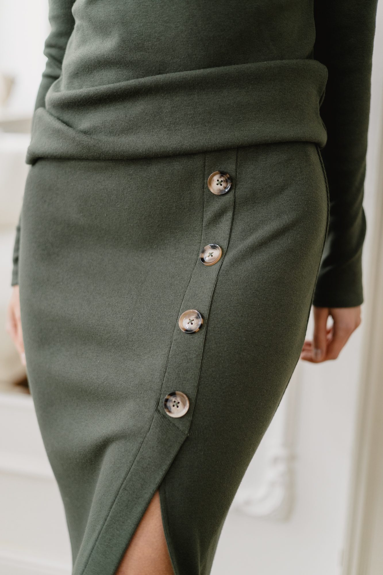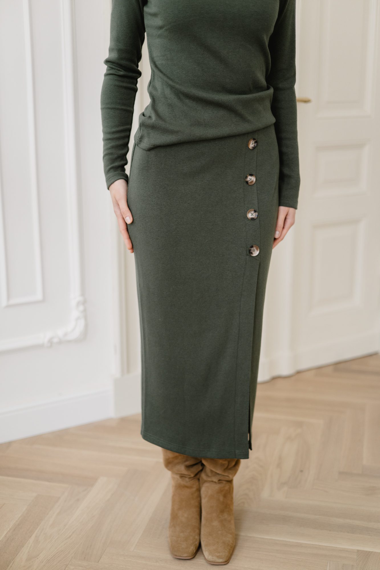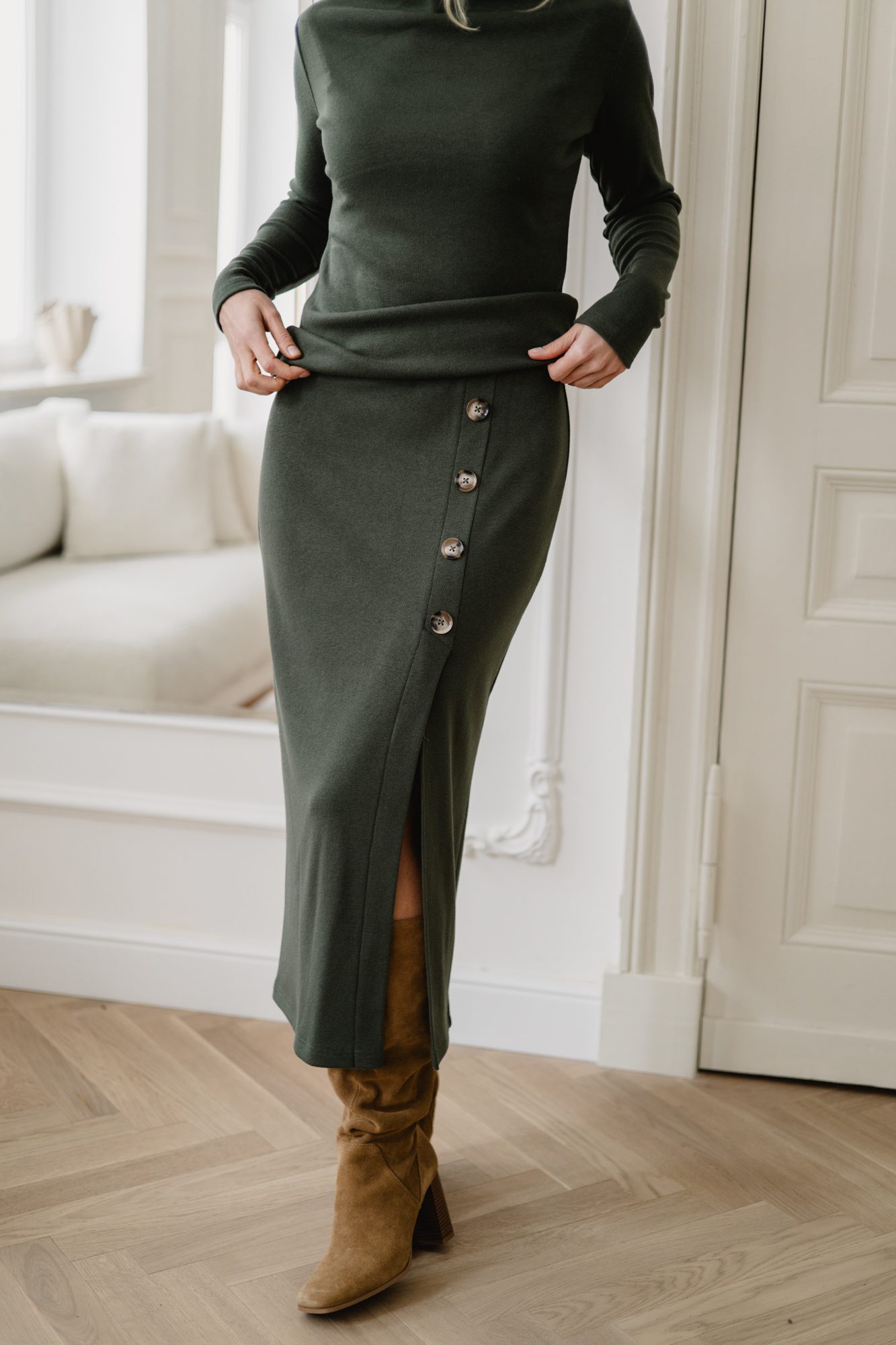 Spódnica Thea to elegancki, dzianinowy model o długości midi, idealny na jesień i zimę. Pionowy rząd guzików oraz zmysłowe rozcięcie pięknie podkreślają sylwetkę, dodając lekkości i nowoczesnego charakteru. Elastyczny pas zapewnia wygodę noszenia, a stonowany ciepły odcień zieleni świetnie łączy się z kozakami, swetrami i klasycznymi topami. Doskonała do codziennych, biurowych i wieczornych stylizacji.