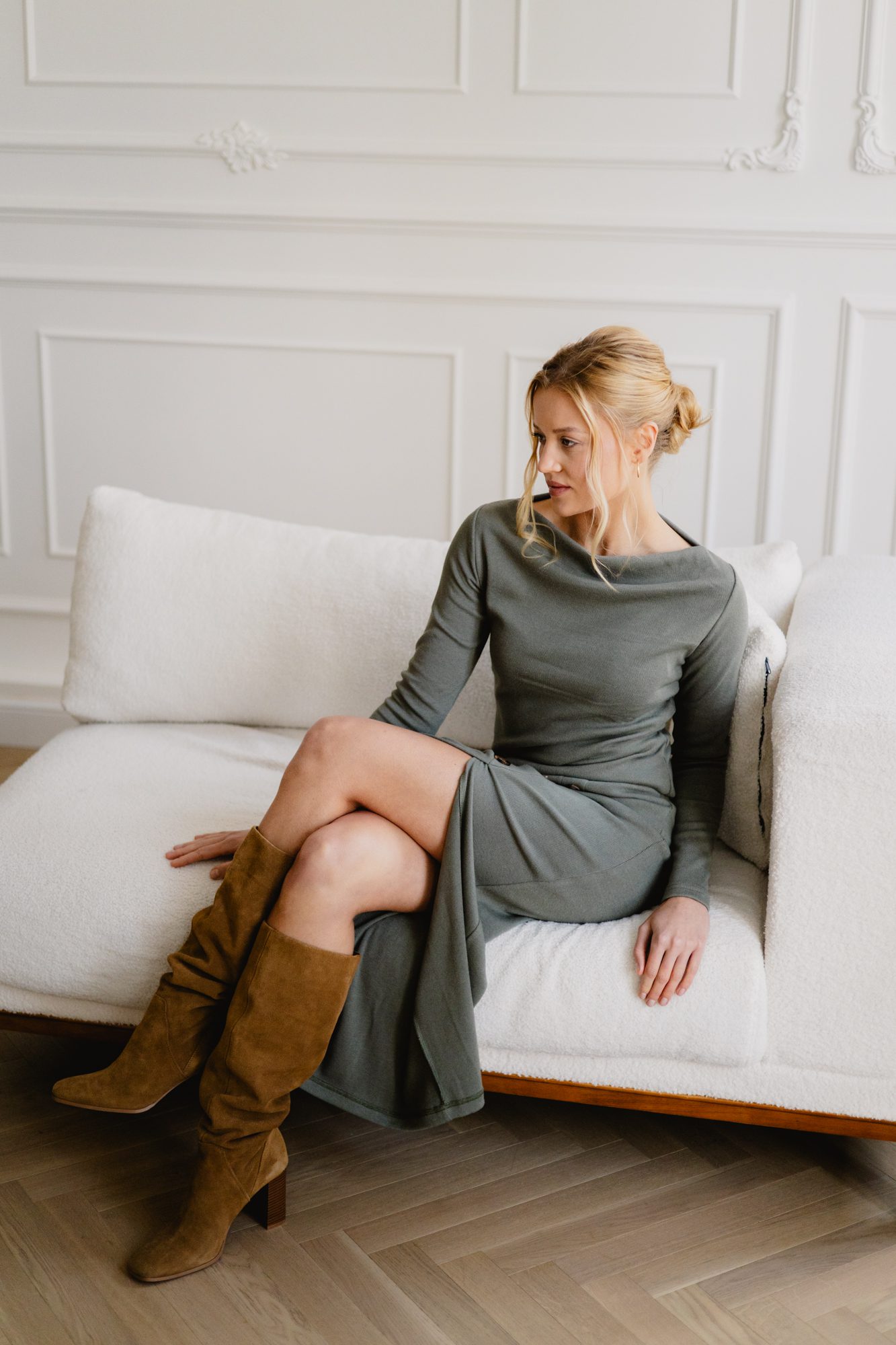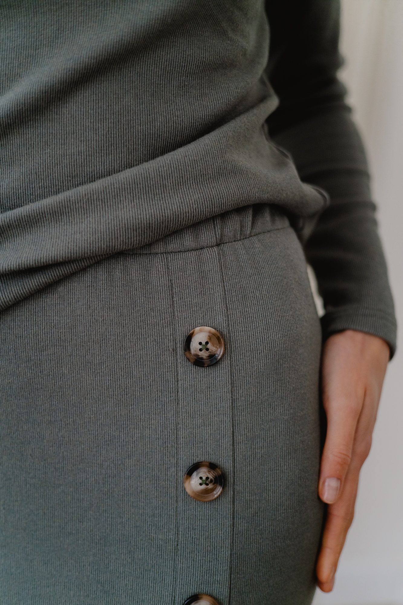 Spódnica Thea to elegancki, dzianinowy model o długości midi, idealny na jesień i zimę. Pionowy rząd guzików oraz zmysłowe rozcięcie pięknie podkreślają sylwetkę, dodając lekkości i nowoczesnego charakteru. Elastyczny pas zapewnia wygodę noszenia, a stonowany chłodny odcień zieleni świetnie łączy się z kozakami, swetrami i klasycznymi topami. Doskonała do codziennych, biurowych i wieczornych stylizacji.