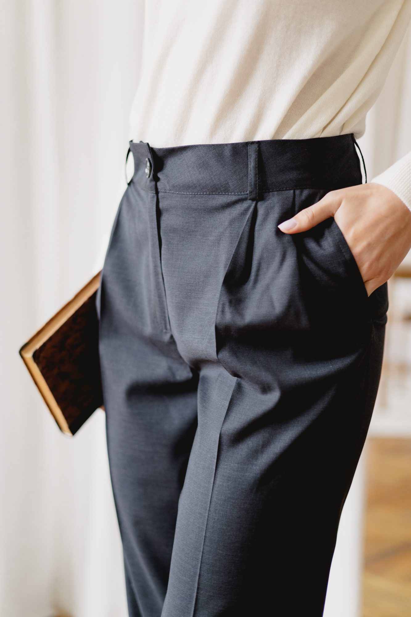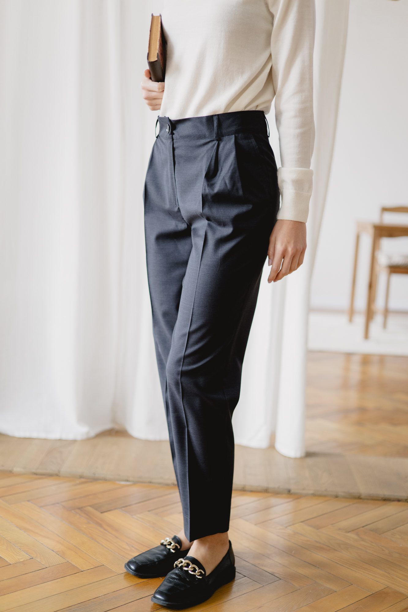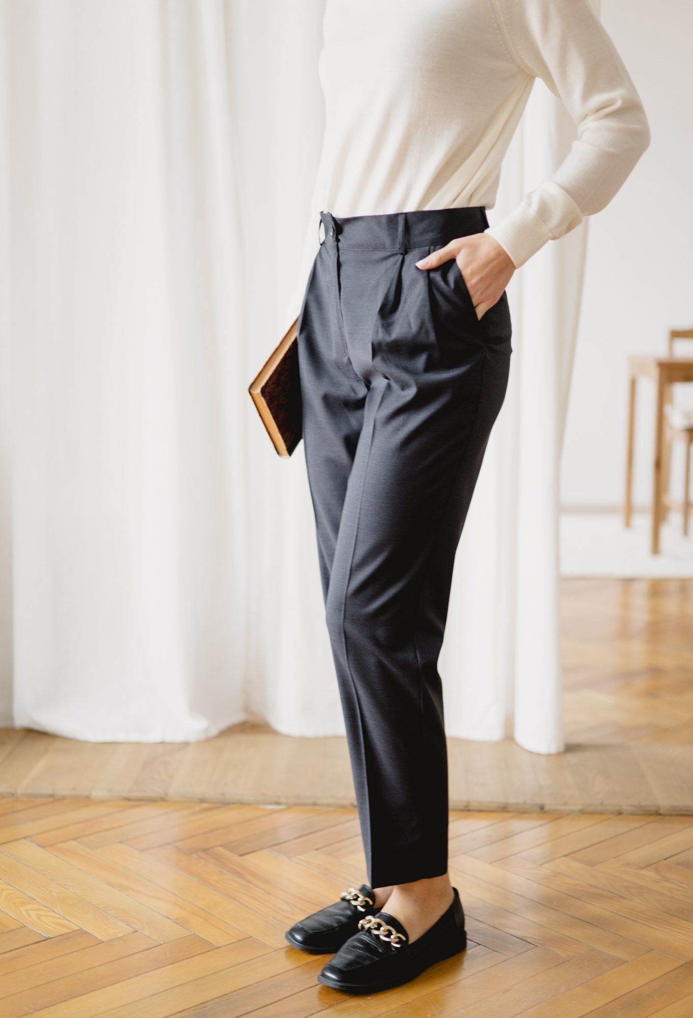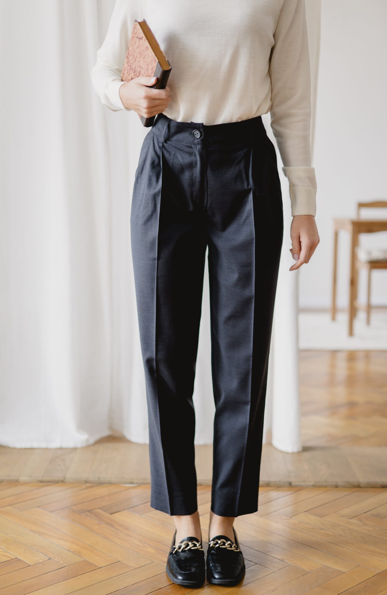Spodnie Colin to klasyczne spodnie z kantem, delikatnie zwężane ku dołowi. Tym razem uszyliśmy je z eleganckiej i nietuzinkowej tkaniny z wełną. Dzięki wełnie w składzie spodnie zapewnią doskonałą termoregulację i ciepło w chłodniejsze dni. Nogawki sięgają do kostek, istnieje możliwość ich podwinięcia w przypadku zbyt długiej długości. Idealnie nadają się zarówno na co dzień, jak i na bardziej oficjalne wyjścia. Nie ulegają gnieceniu w znaczącym stopniu.