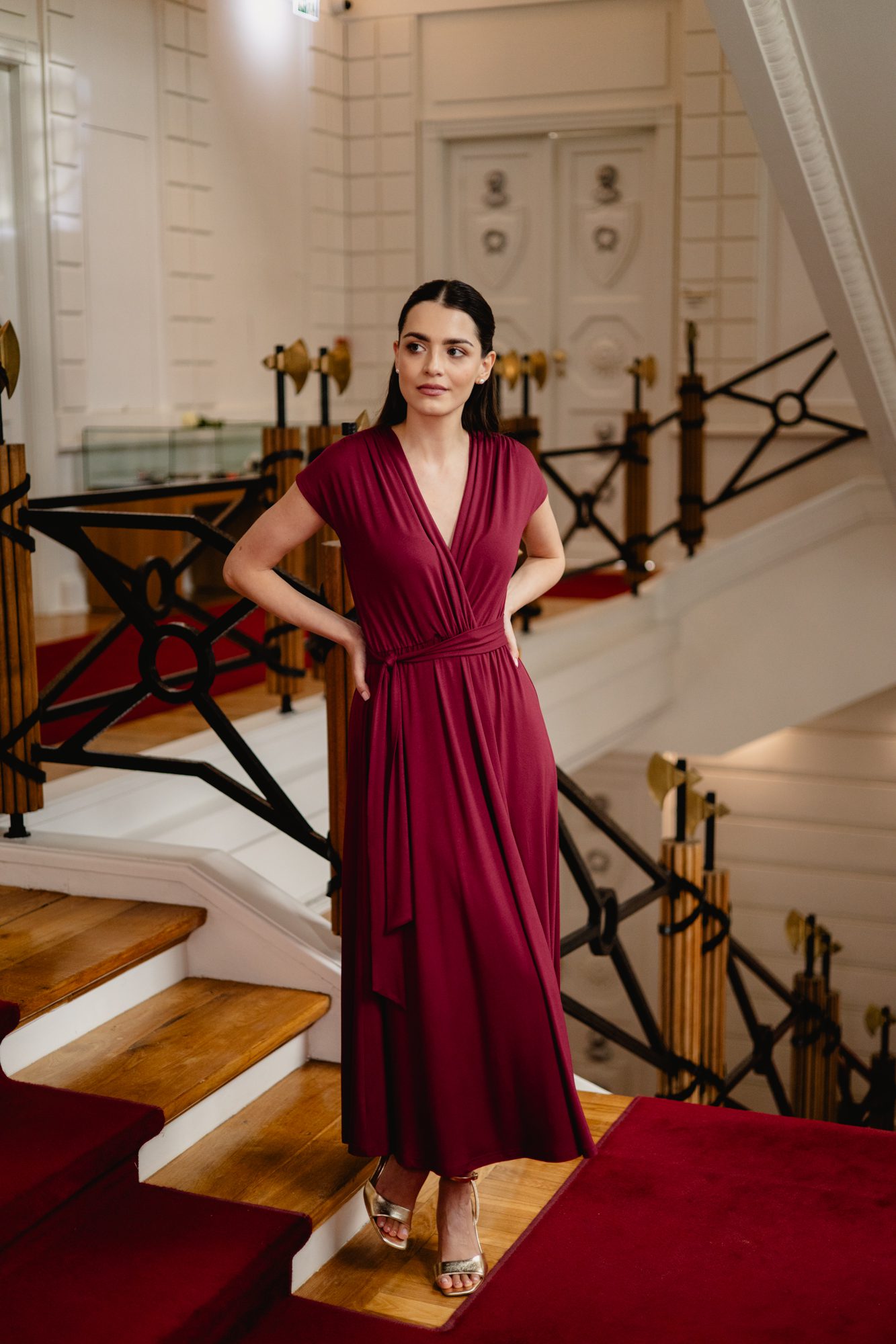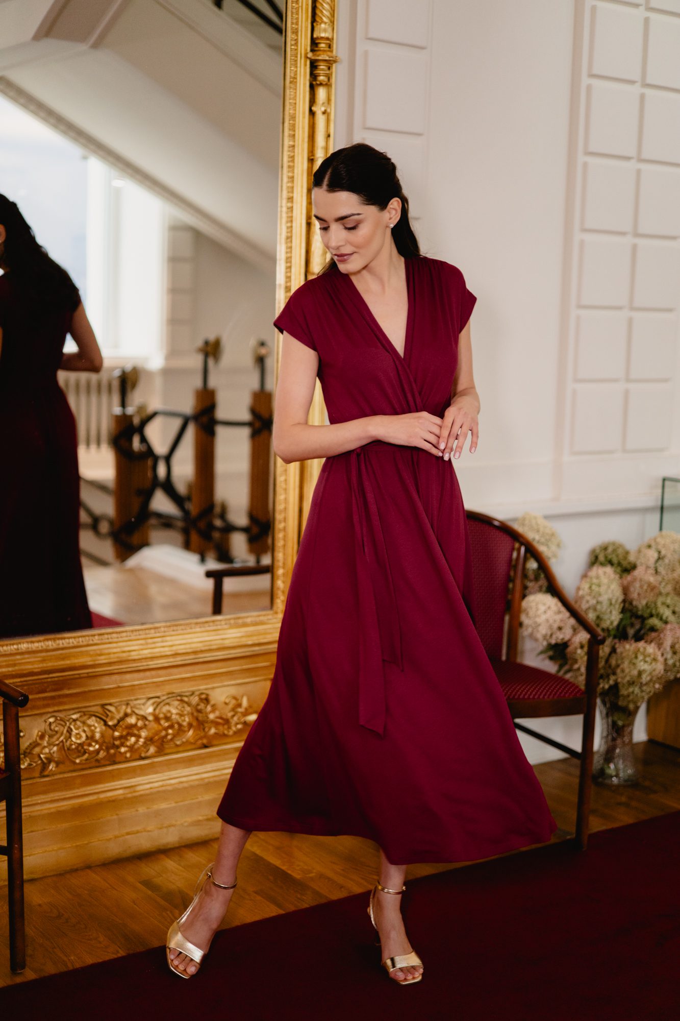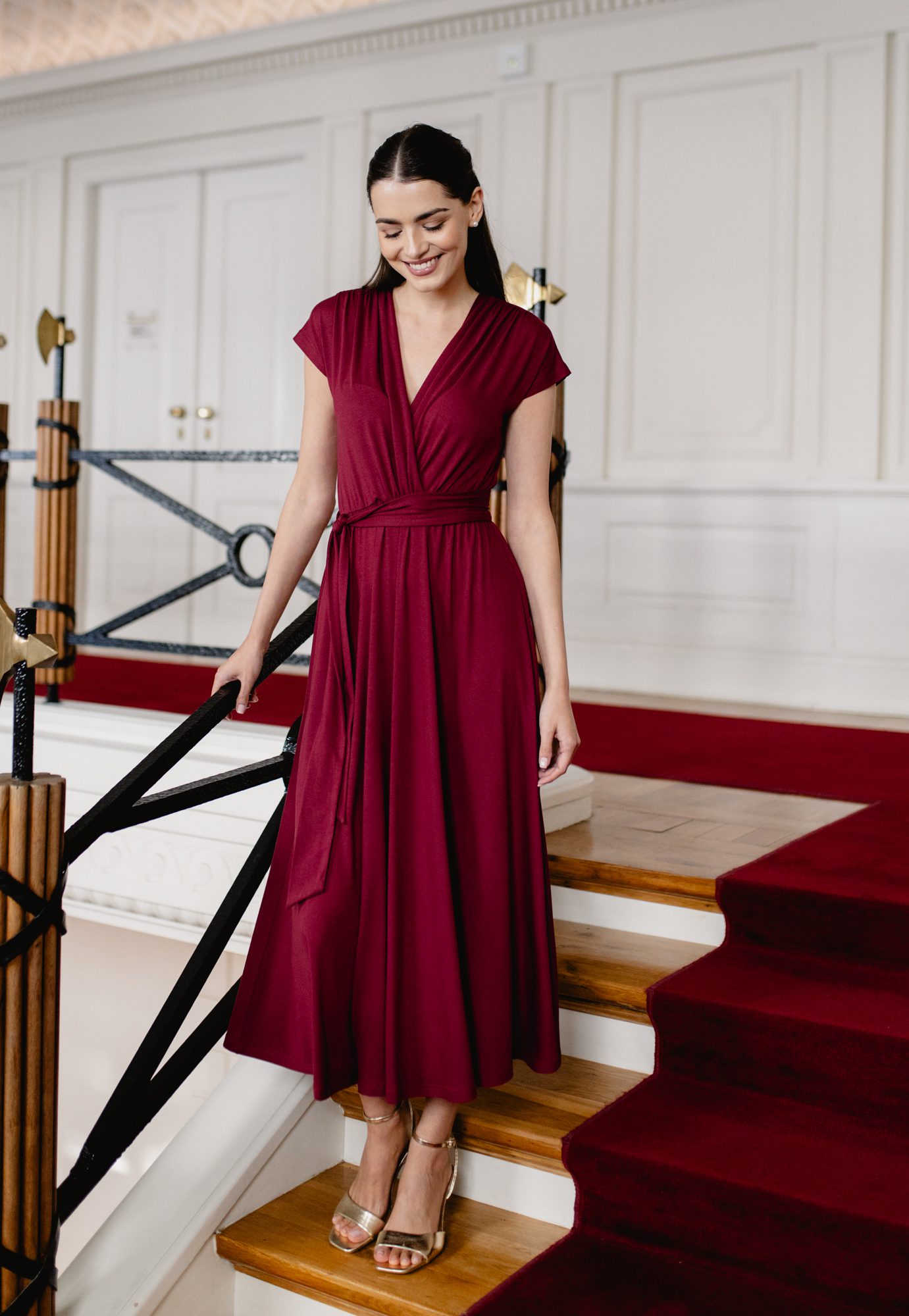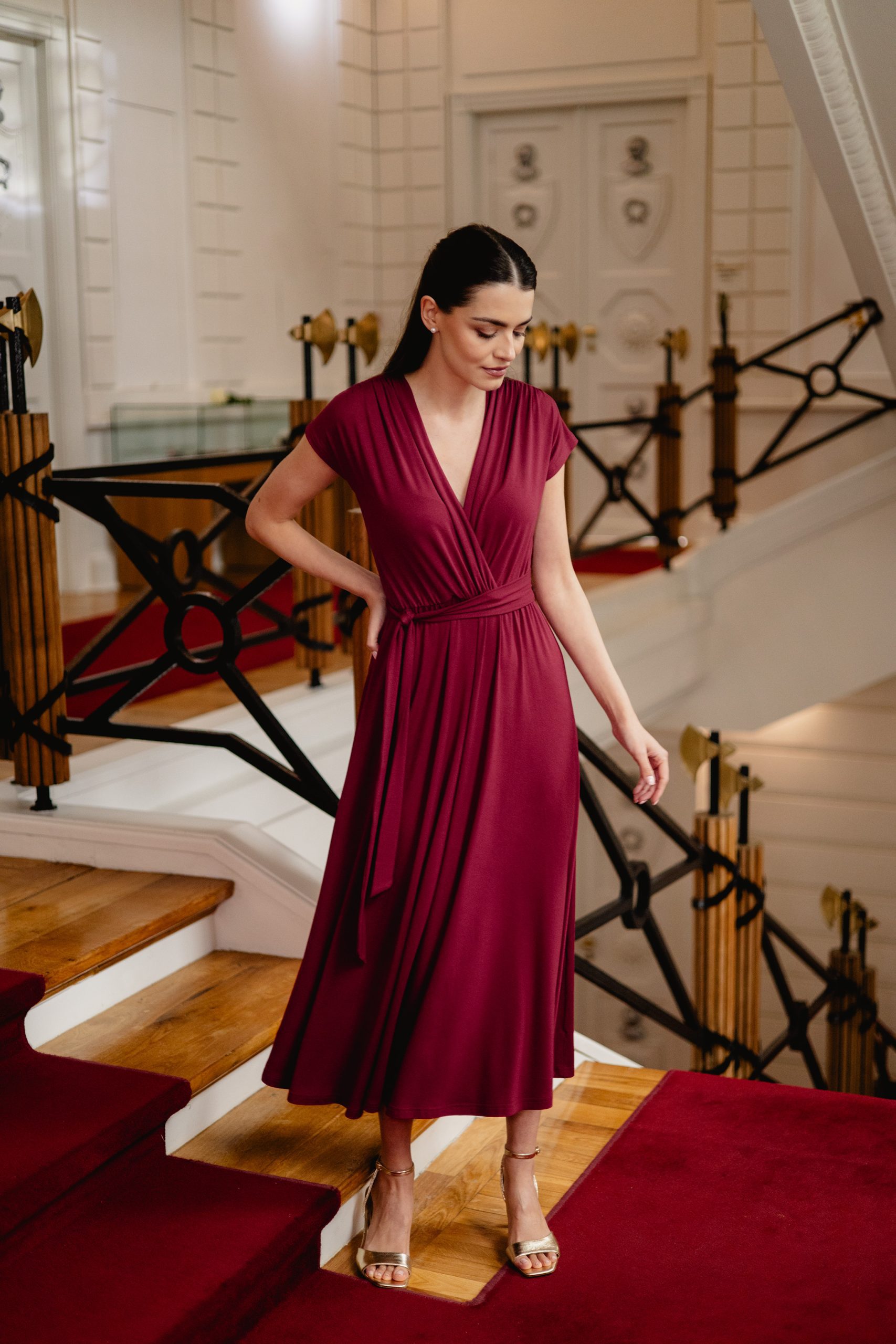 Model posiada kopertowy dekolt w kształcie litery V oraz krótkie rękawy, które nadają całości lekkości. Wiązanie w talii pozwala dopasować sukienkę do sylwetki i subtelnie ją podkreślić. Rozkloszowany dół o długości maxi swobodnie układa się w ruchu, tworząc elegancki i kobiecy efekt.