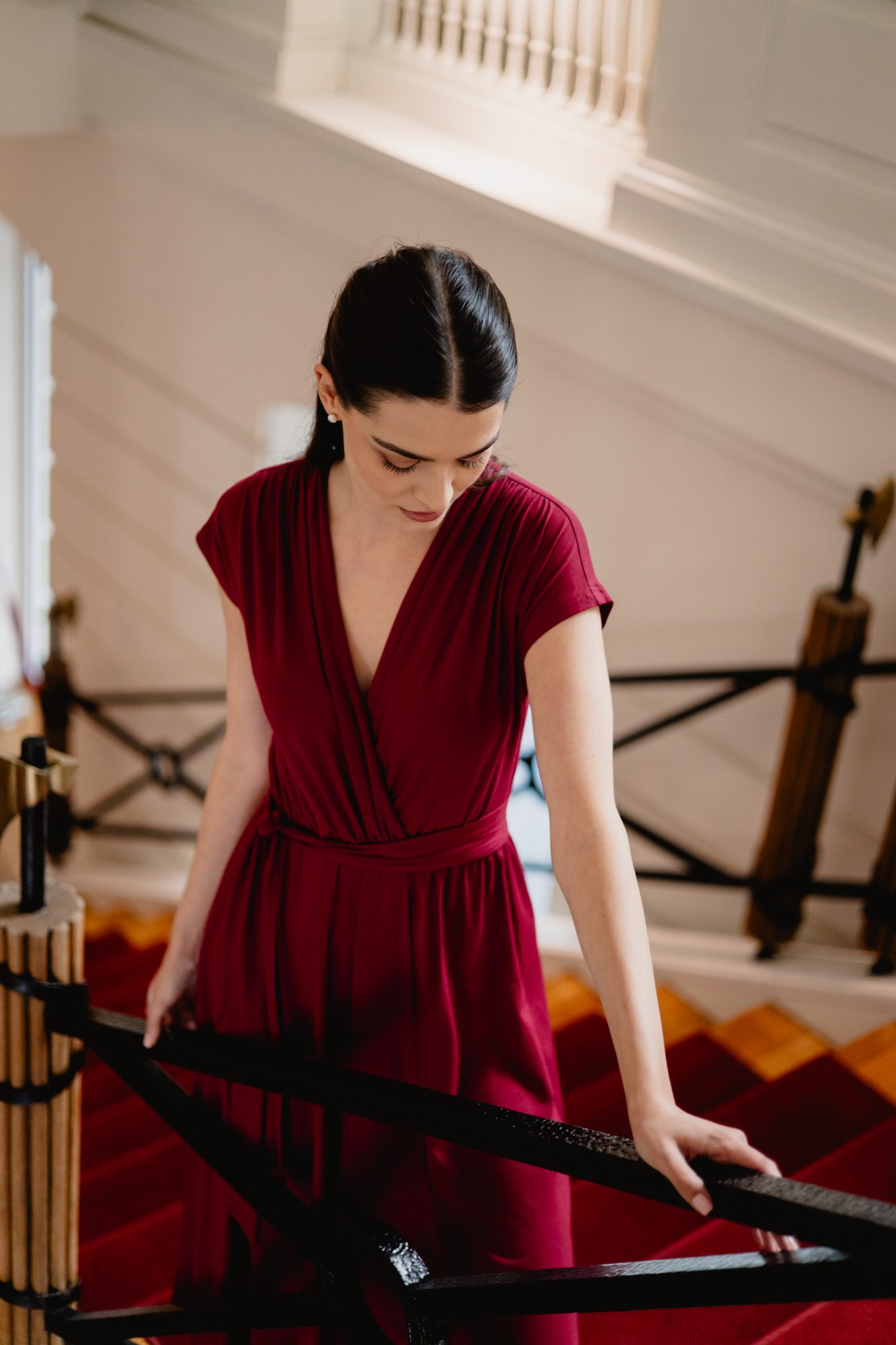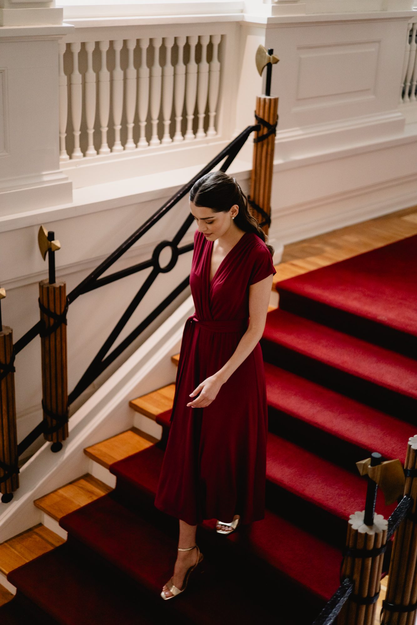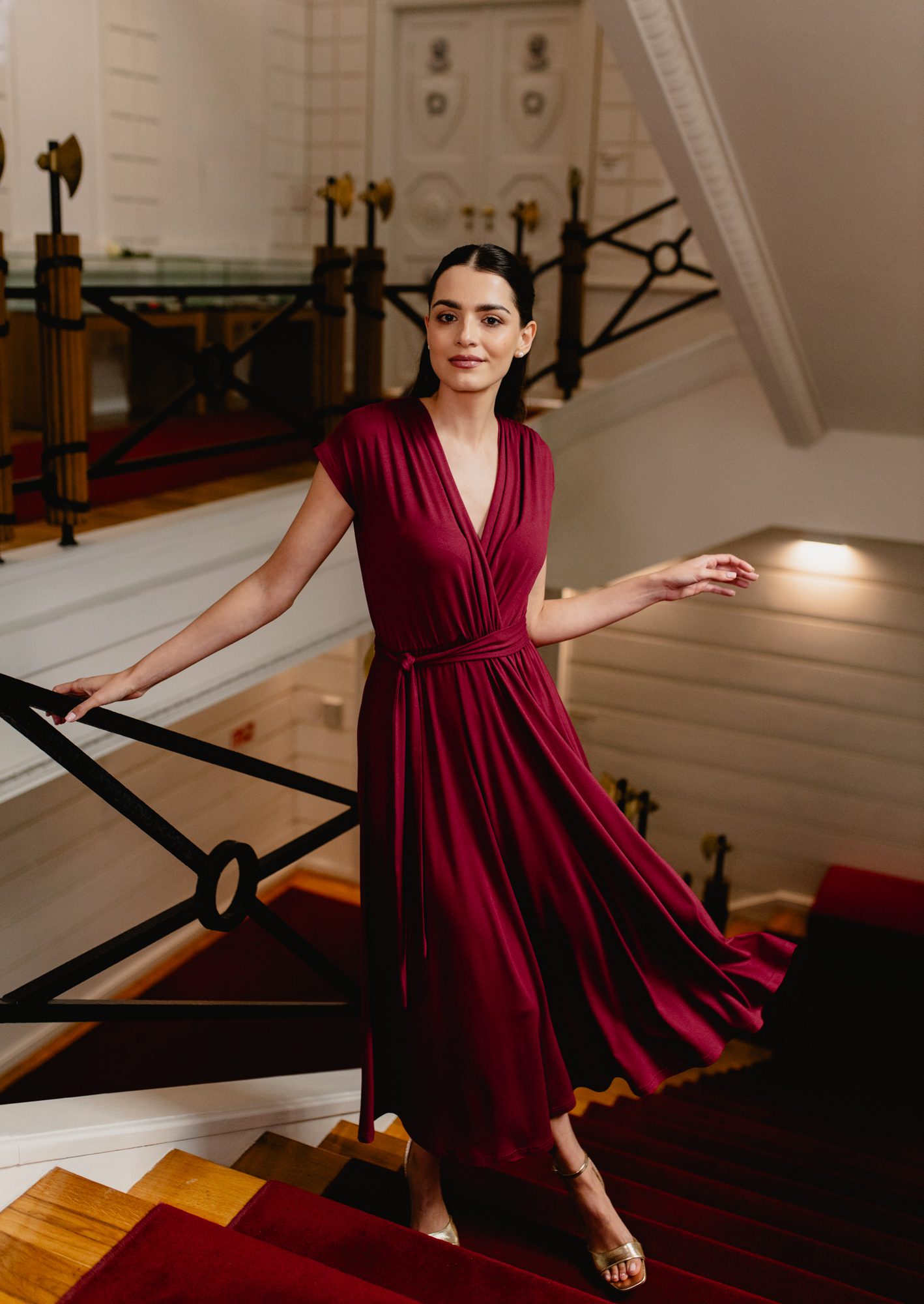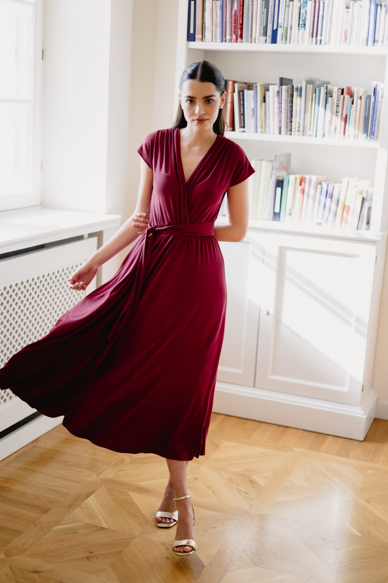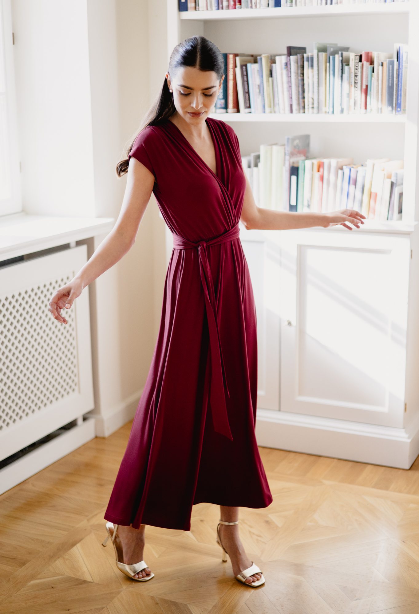 Model posiada kopertowy dekolt w kształcie litery V oraz krótkie rękawy, które nadają całości lekkości. Wiązanie w talii pozwala dopasować sukienkę do sylwetki i subtelnie ją podkreślić. Rozkloszowany dół o długości maxi swobodnie układa się w ruchu, tworząc elegancki i kobiecy efekt.