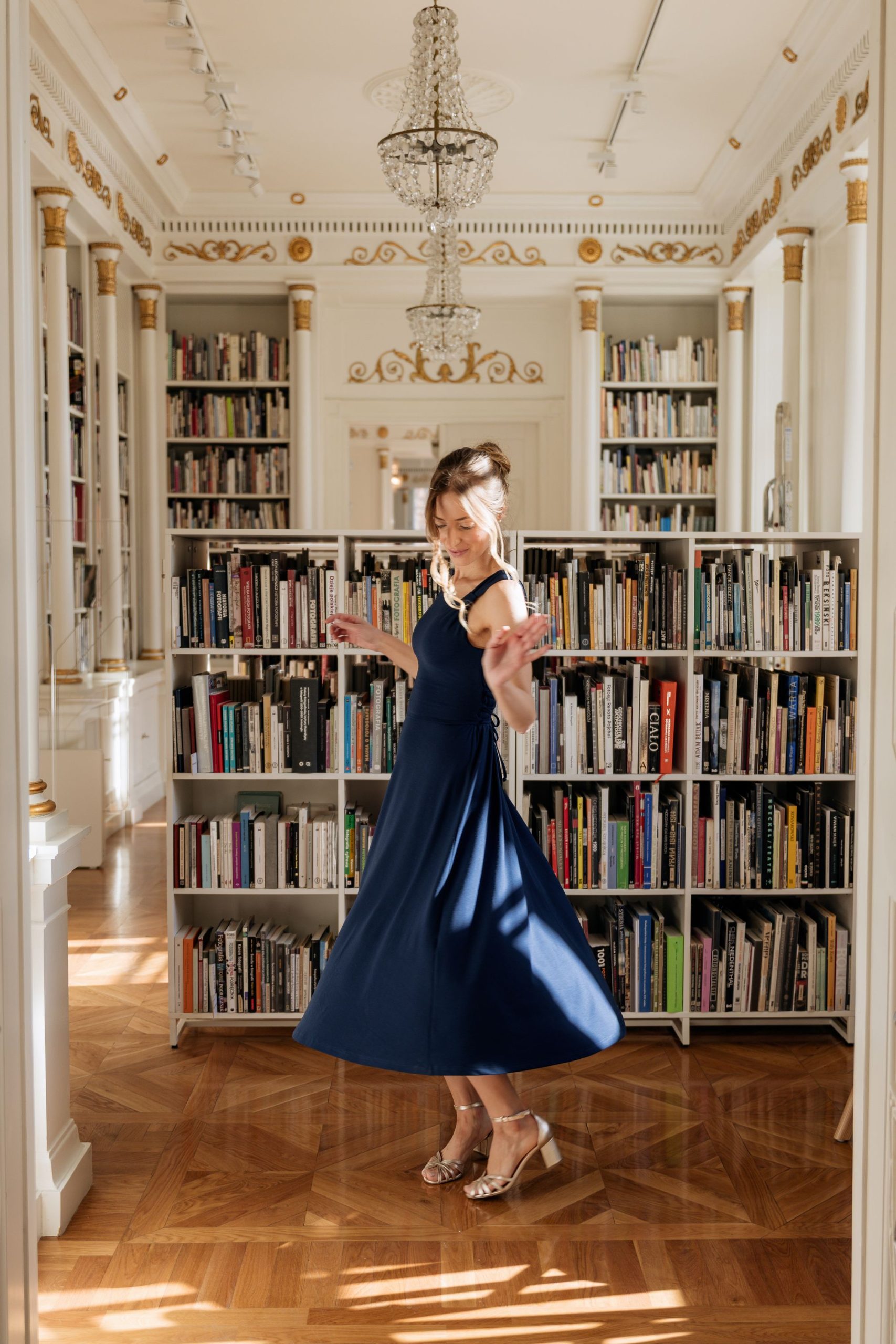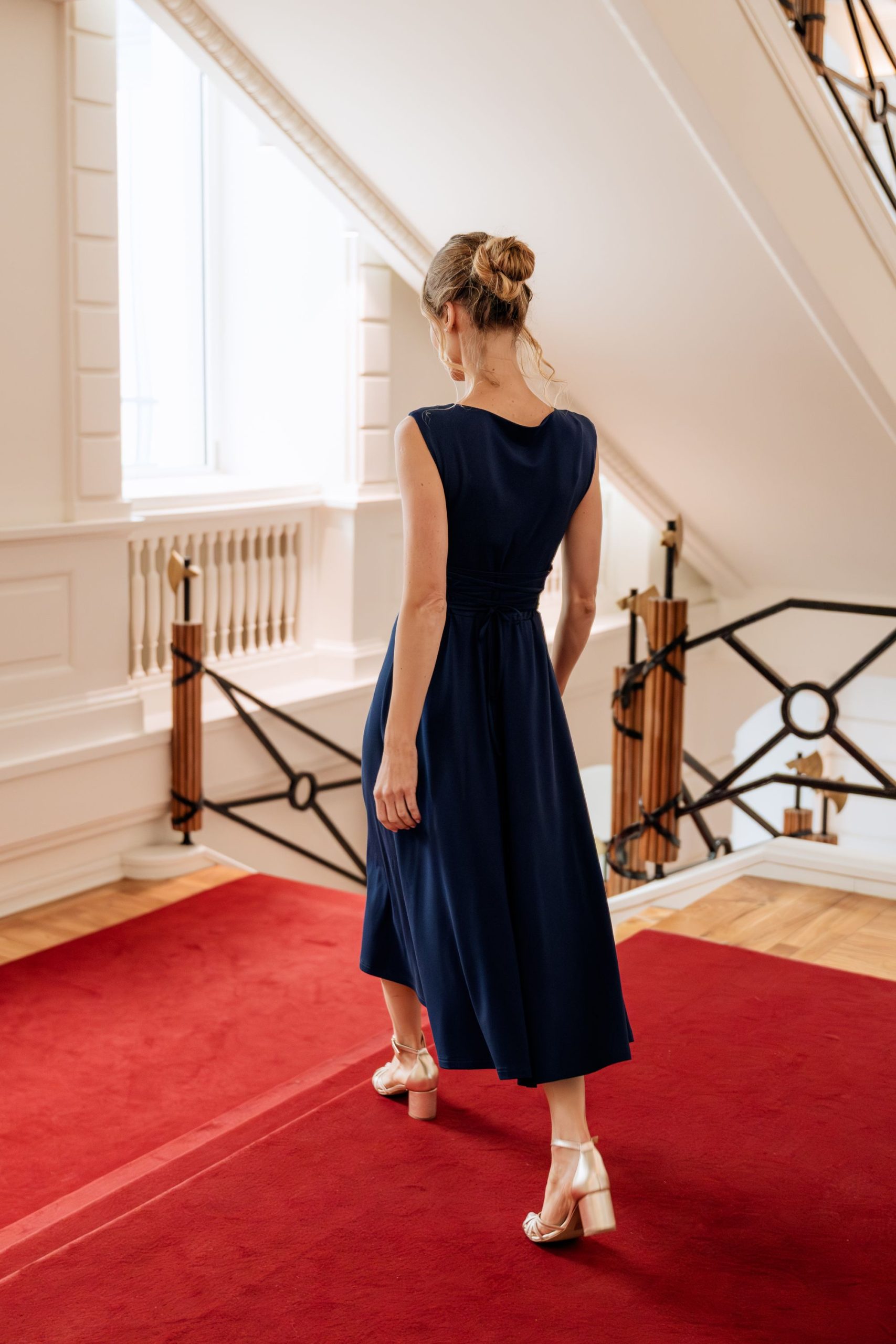 Model posiada dopasowaną górę bez rękawów oraz subtelny dekolt, który nadaje całości nowoczesnego charakteru. Delikatne marszczenie przy ramieniu stanowi elegancki detal, który wyróżnia sukienkę. Talia została podkreślona, a rozkloszowany dół o długości midi swobodnie układa się w ruchu, tworząc harmonijną i kobiecą linię.