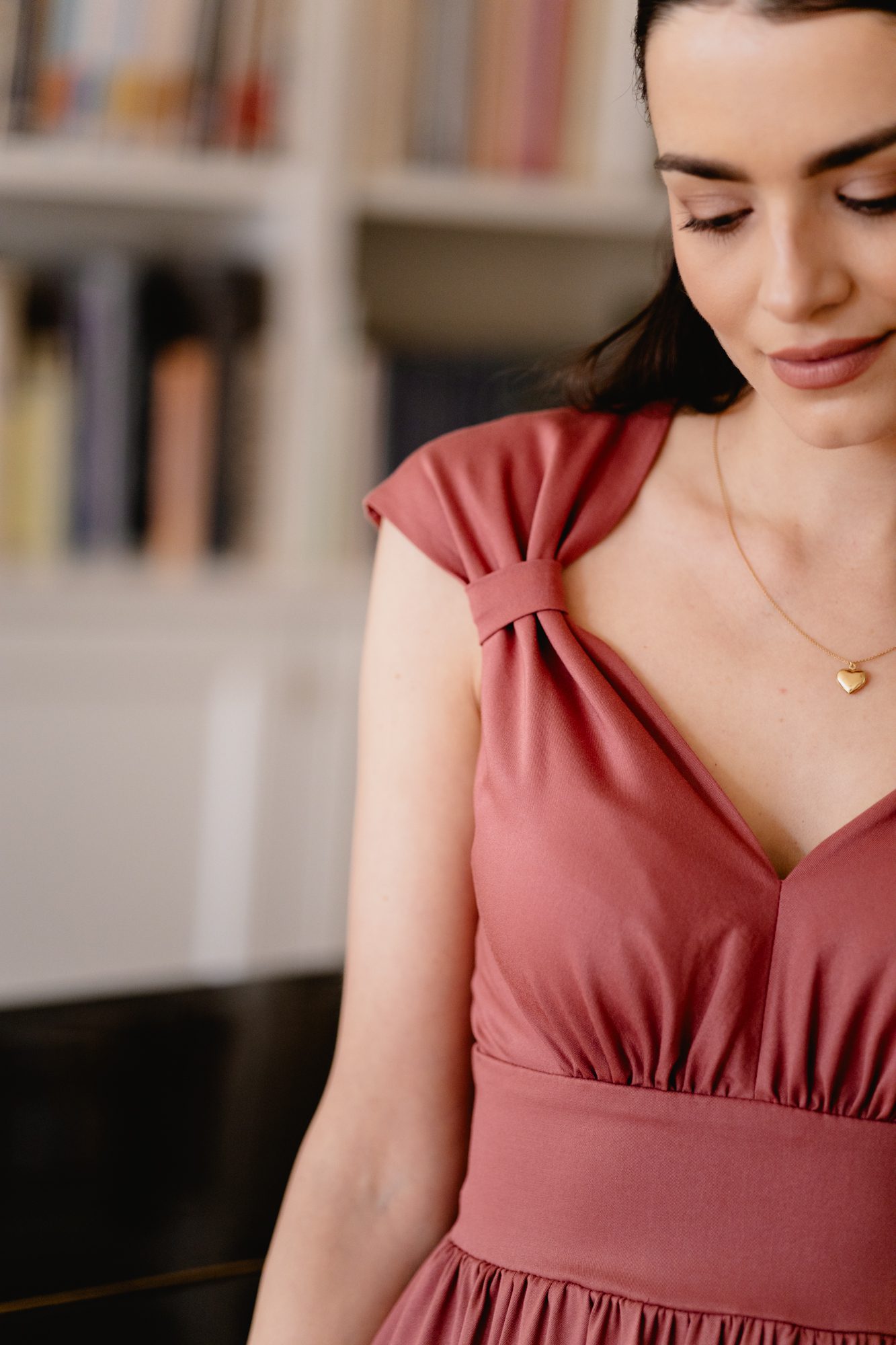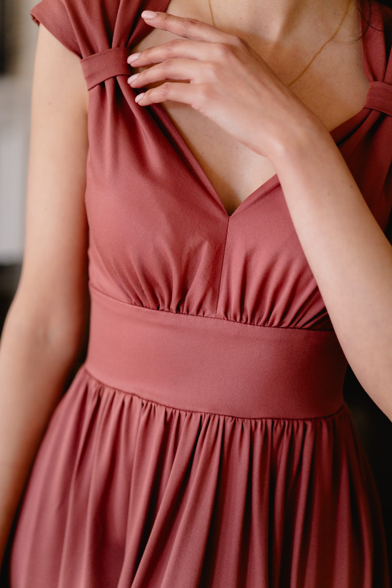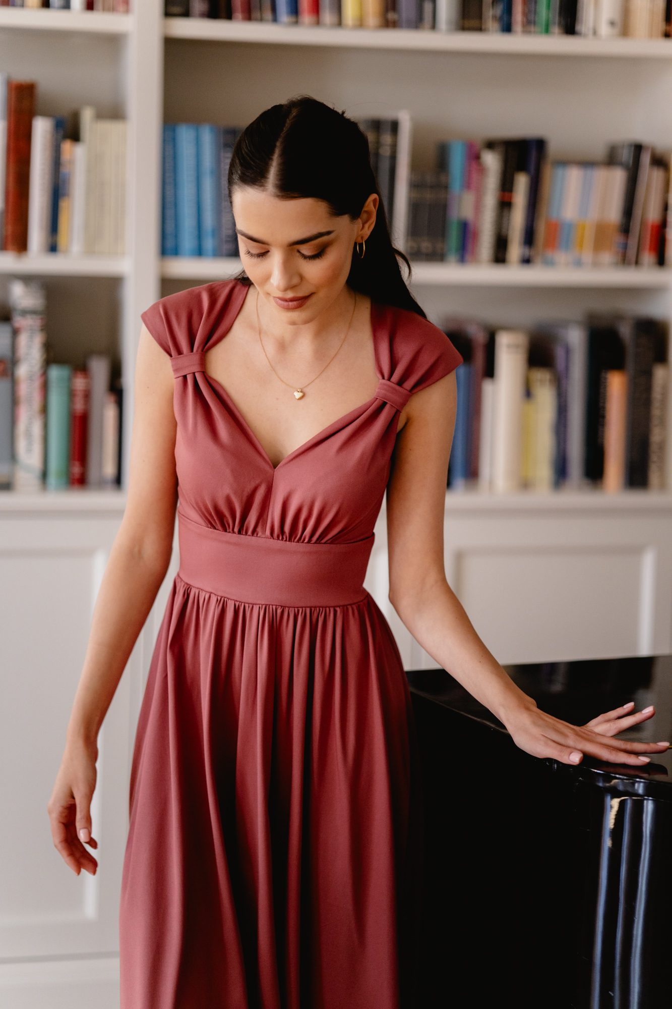 Sukienka Carmen marsala – elegancka sukienka z dekoltem „serce”