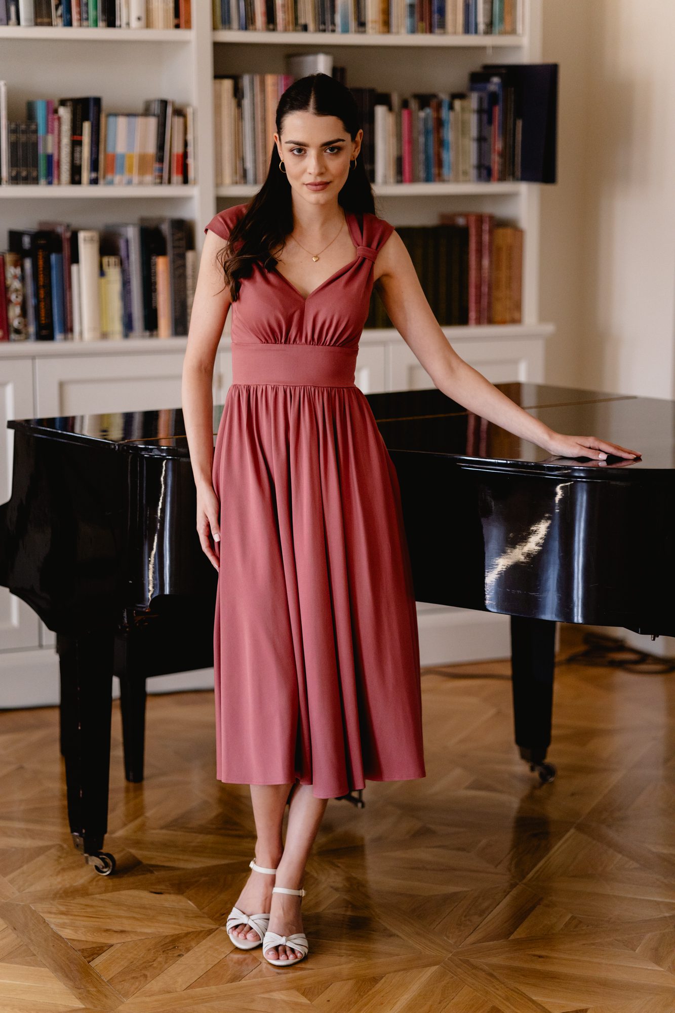 Model Carmen posiada kobiecy dekolt w kształcie serca. Można zmieniać jego kształt dzięki ruchomym pierścieniom, które można przesuwać w celu uzyskania głębszego dekoltu w serce, bądź mniejszego w „serek”. Sukienka posiada szeroki pas, który znakomicie podkreśla talię. Zapinana jest na zamek kryty z tyłu sukienki. Posiada delikatne rękawy, których kształt można zmieniać przesuwając pierścienie. Długość midi i rozszerzana spódnica wspaniale nadają się do celebracji szczególnych uroczystości. Tkanina, dzięki elastanowi w składzie, „pracuje” na ciele i dodaje wygody w trakcie noszenia. Wysokiej jakości materiał jest mięsisty i mimo, że posiada naturalny skład, nie ulega gnieceniu.