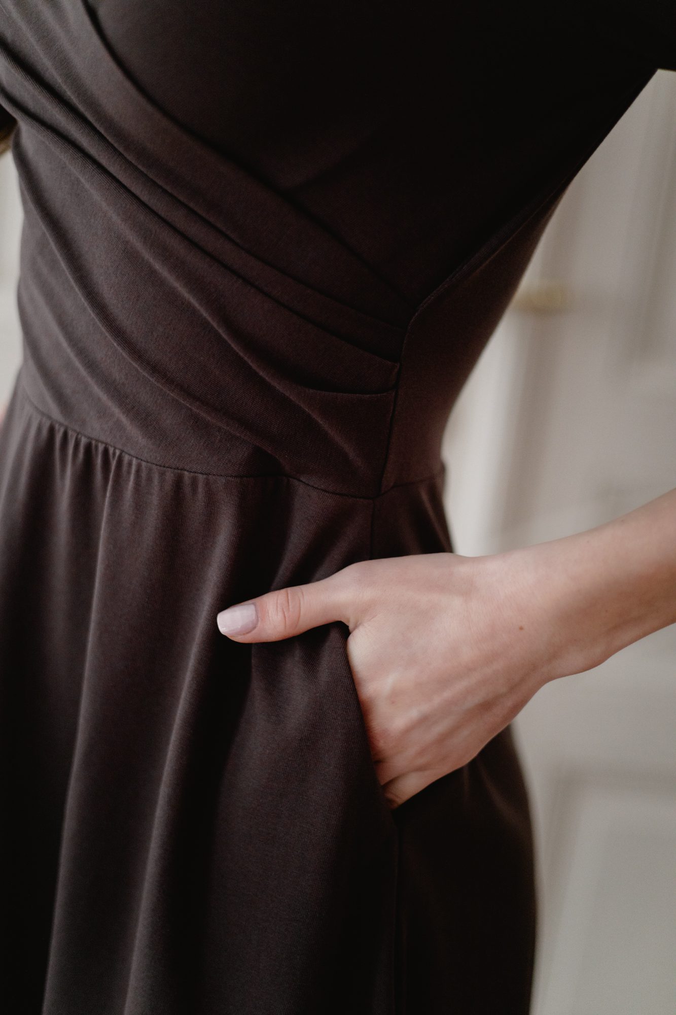 Nicole uszyliśmy z bawełny z domieszką elastanu. Posiada kopertowy dekolt z delikatnymi zakładkami. Dół sukienki został uszyty z pół koła, nie posiada marszczeń w talii i wysmukla sylwetkę. Posiada kieszenie w bocznych szwach spódnicy. Rękaw w długości 3/4 zwężany ku dołowi umożliwia wygodne założenie na sukienkę swetra, żakietu czy płaszcza. Rękaw jest delikatnie marszczony na ramionach. W sukience można karmić piersią.