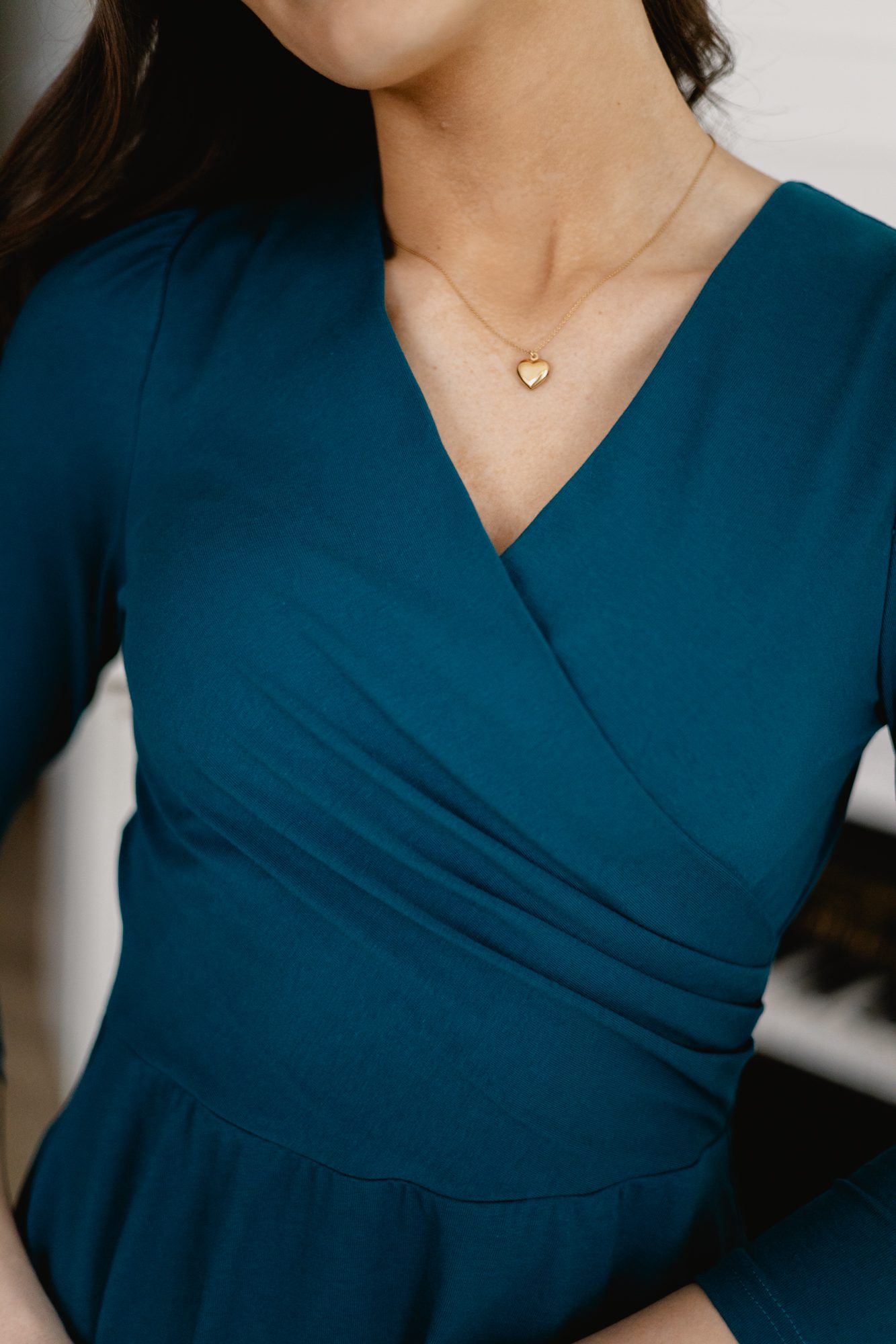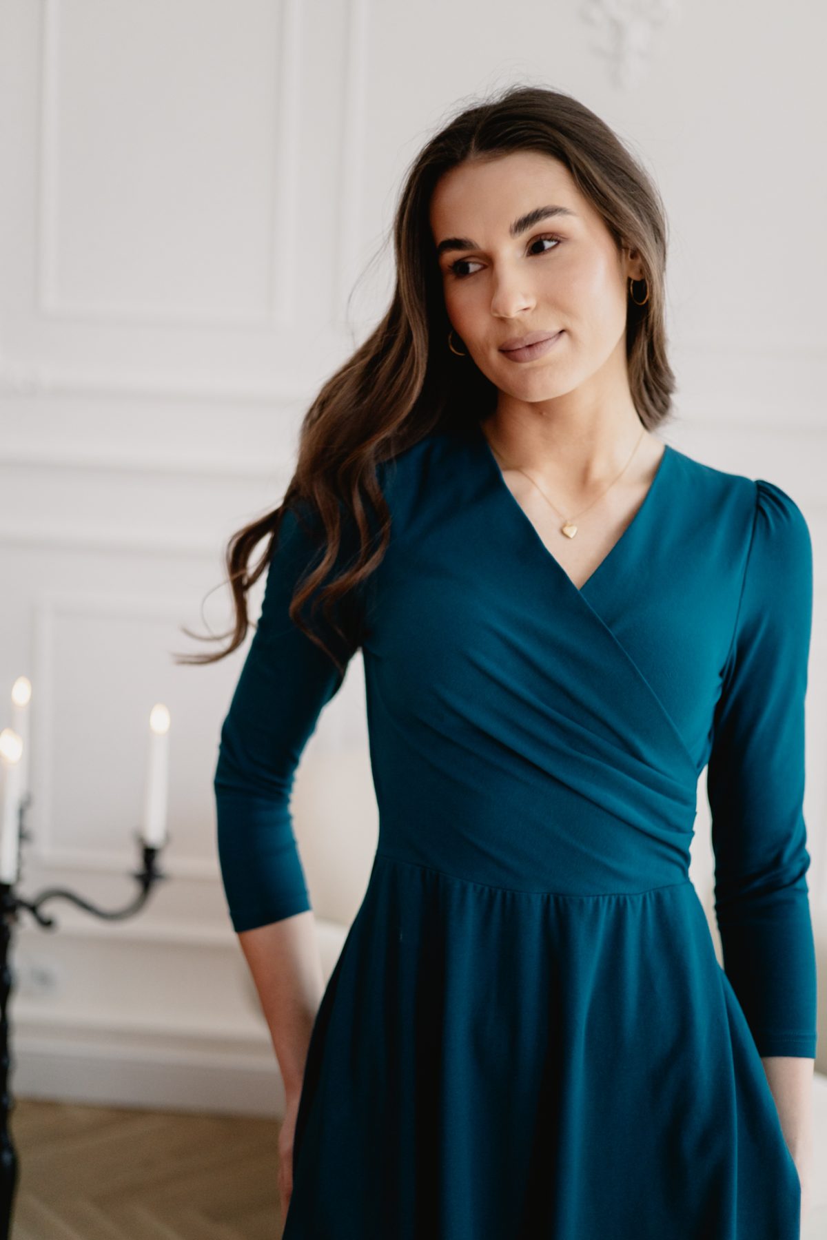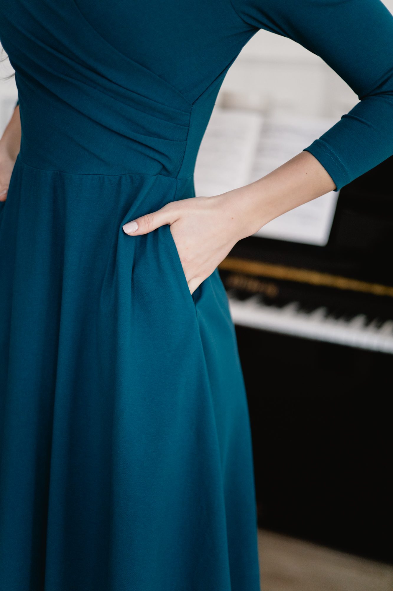 Nicole uszyliśmy z bawełny z domieszką elastanu. Posiada kopertowy dekolt z delikatnymi zakładkami. Dół sukienki został uszyty z pół koła, nie posiada marszczeń w talii i wysmukla sylwetkę. Posiada kieszenie w bocznych szwach spódnicy. Rękaw w długości 3/4 zwężany ku dołowi umożliwia wygodne założenie na sukienkę swetra, żakietu czy płaszcza. Rękaw jest delikatnie marszczony na ramionach. W sukience można karmić piersią.