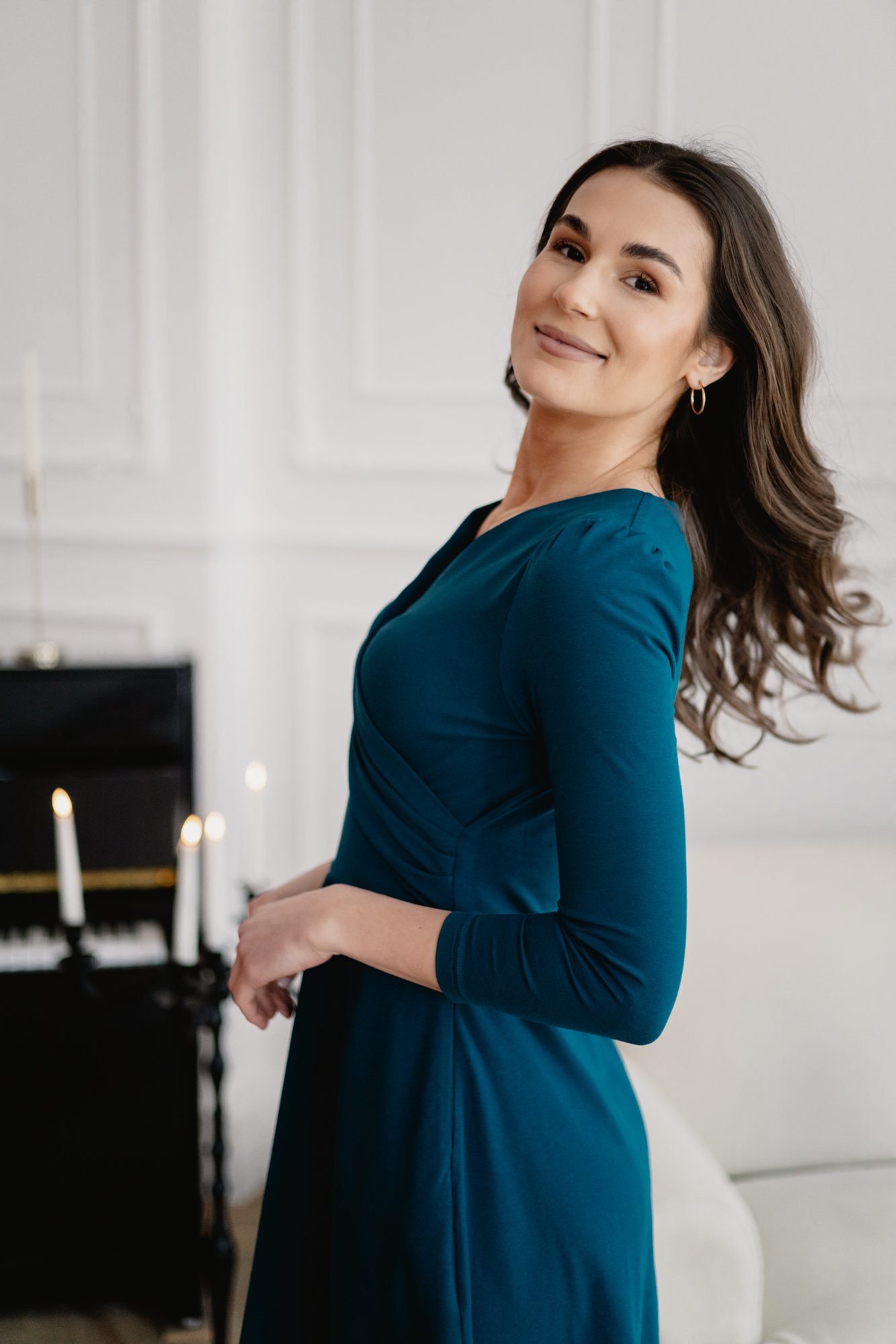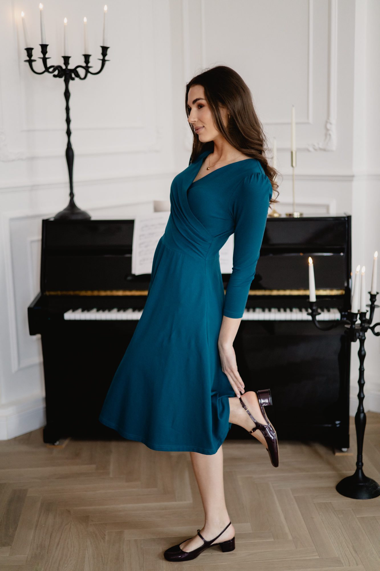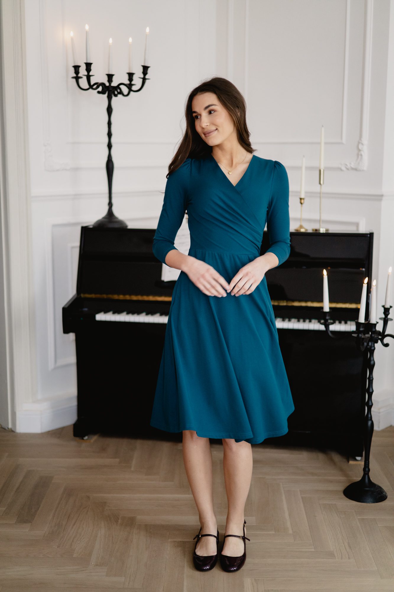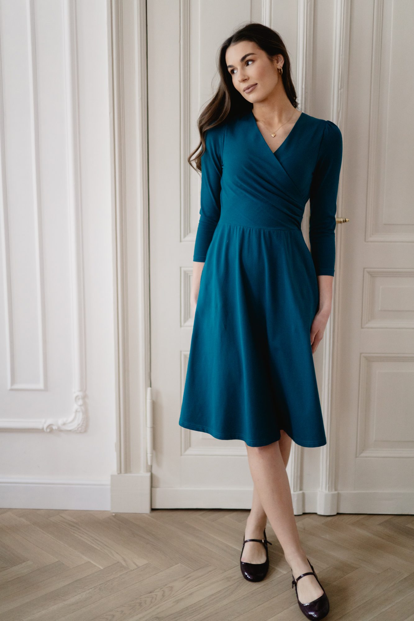 Nicole uszyliśmy z bawełny z domieszką elastanu. Posiada kopertowy dekolt z delikatnymi zakładkami. Dół sukienki został uszyty z pół koła, nie posiada marszczeń w talii i wysmukla sylwetkę. Posiada kieszenie w bocznych szwach spódnicy. Rękaw w długości 3/4 zwężany ku dołowi umożliwia wygodne założenie na sukienkę swetra, żakietu czy płaszcza. Rękaw jest delikatnie marszczony na ramionach. W sukience można karmić piersią.