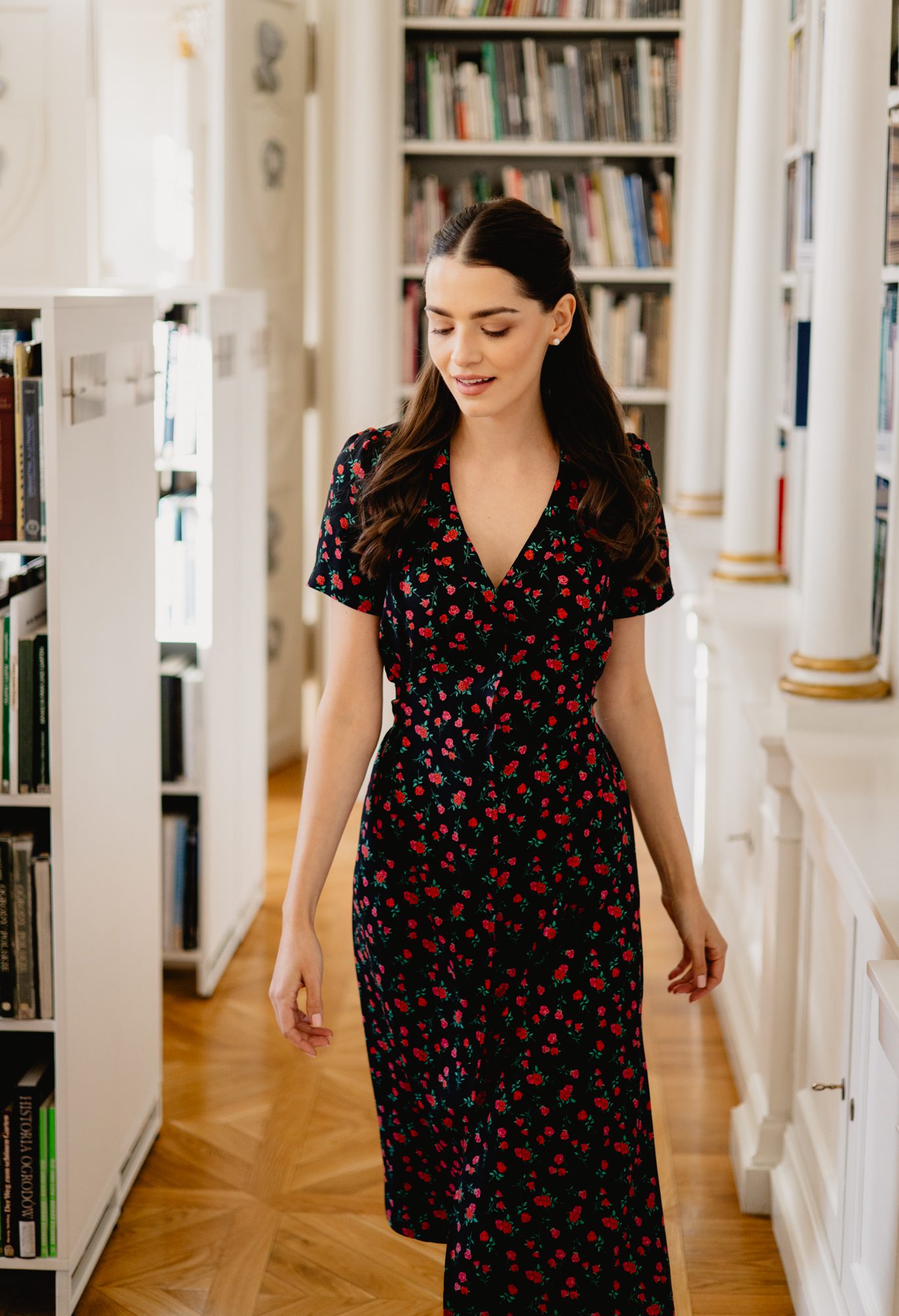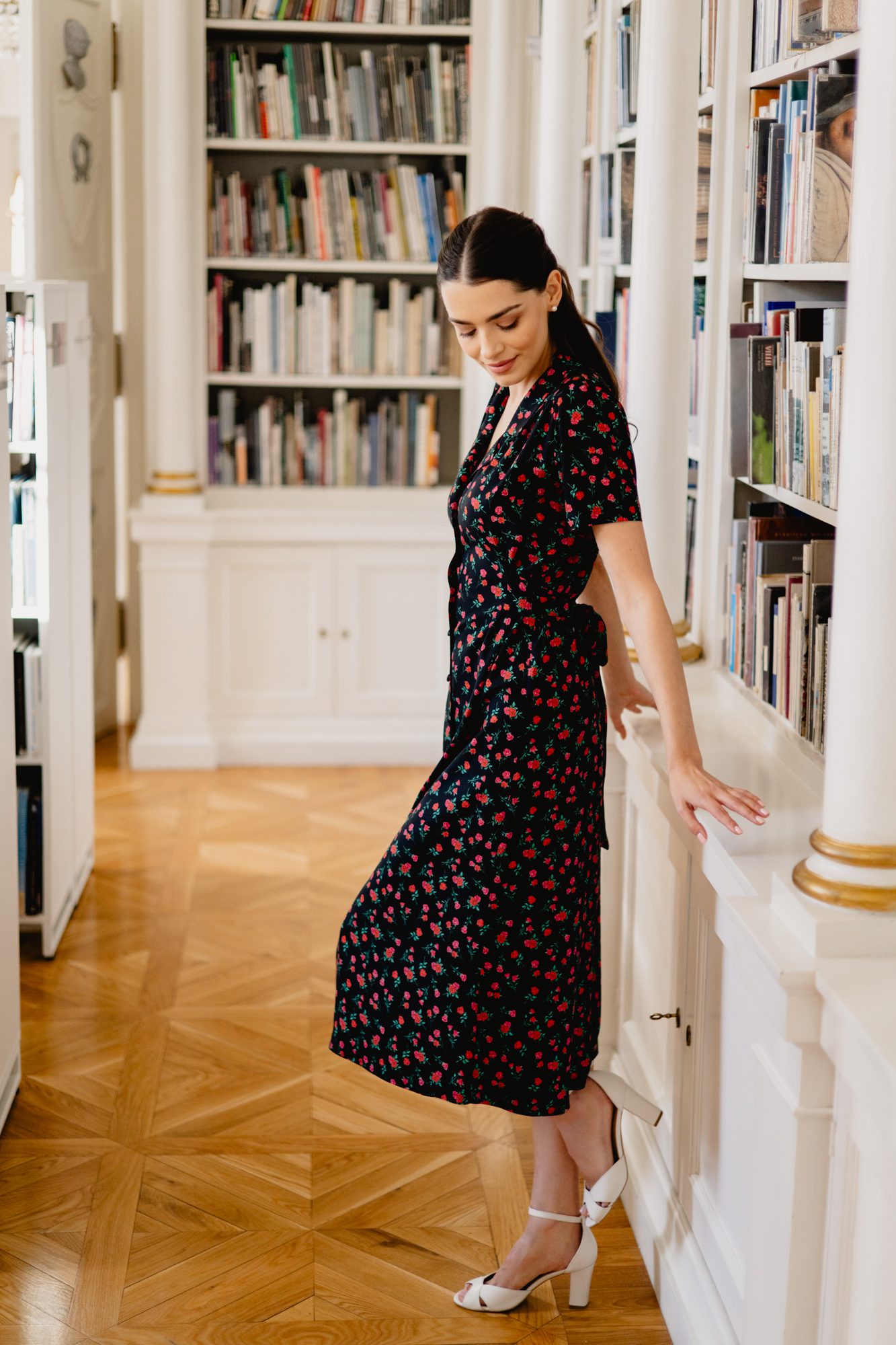 Szmizjerka Camille posiada wygodny, lekko taliowany krój, który wyregulujesz szarfą. Wstęgę możesz przewiązać z tyłu w kokardę lub z przodu w węzeł. Sukienkę uszyliśmy z wiskozy z domieszką elastanu w kwiatowy wzór. Model po całej długości jest zapinany na oblekane materiałem guziki. Kołnierzyk nawiązuje do klasycznej mody i wspaniale podkreśla dekolt. Guziki umożliwiają regulację rozcięcia. Tkanina jest przyjemna w dotyku i nie ulega gnieceniu w znaczącym stopniu dzięki elastycznej strukturze. Model idealnie komponuje się z czółenkami, botkami, kozakami, czy szpilkami.
