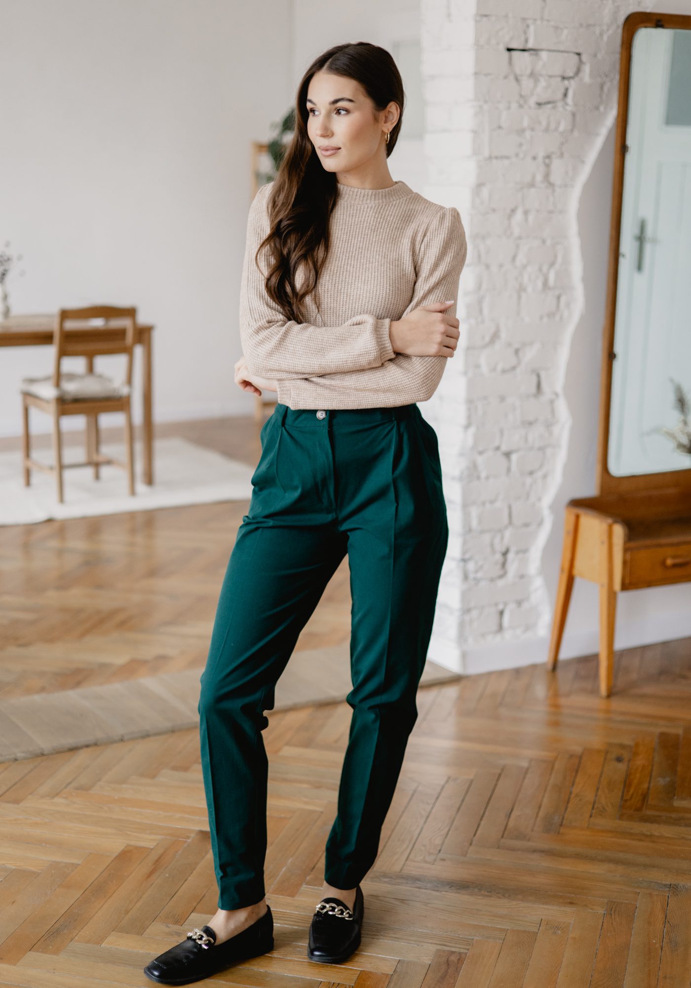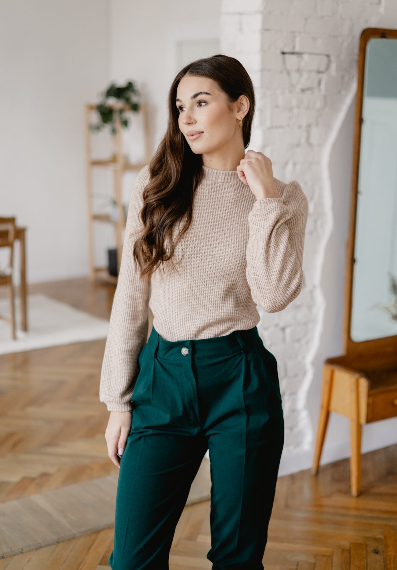 Sweterek Aurore to klasyczny sweter z półgolfem. Materiał sweterka jest miły w dotyku i nie mechaci się. Efektowne szersze rękawy zebrane w mankiet nawiązują do romantycznego stylu. Delikatne marszczenia na ramionach dodają swetrowi lekkości, są jednak na tyle drobne, że nie poszerzają ramion. Krój swetra jest taliowany.
