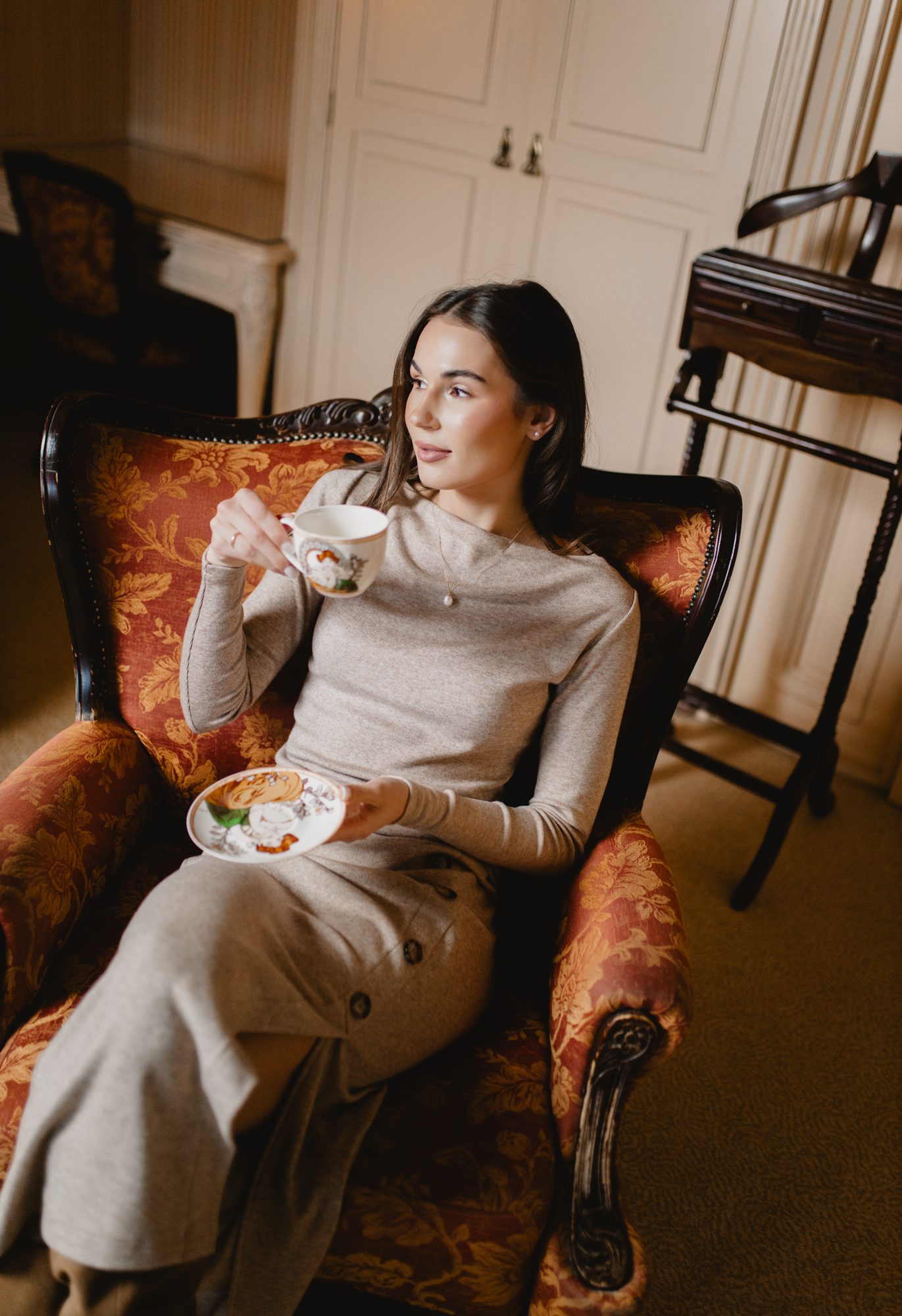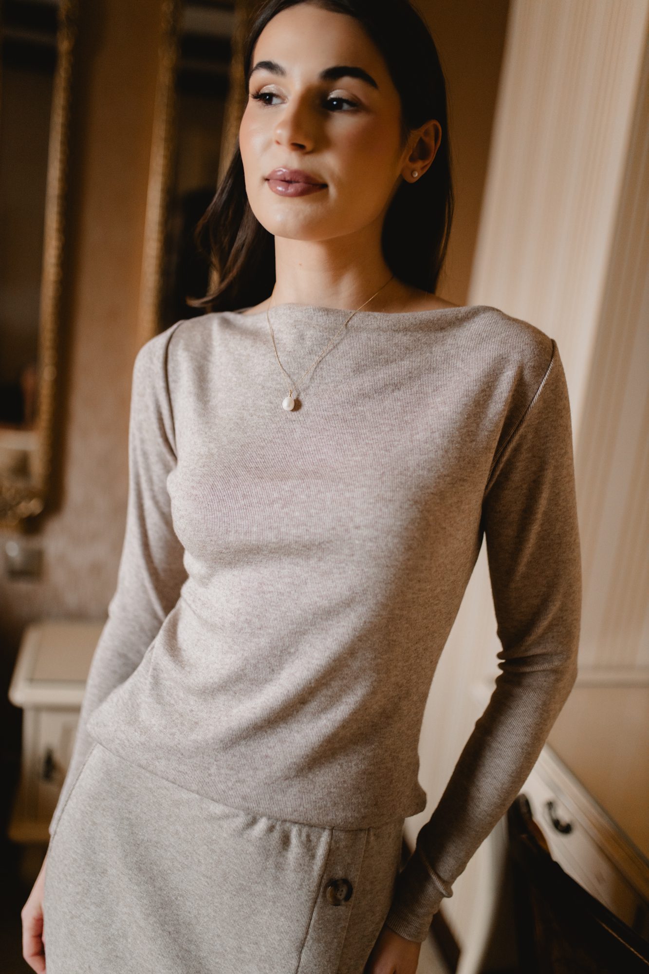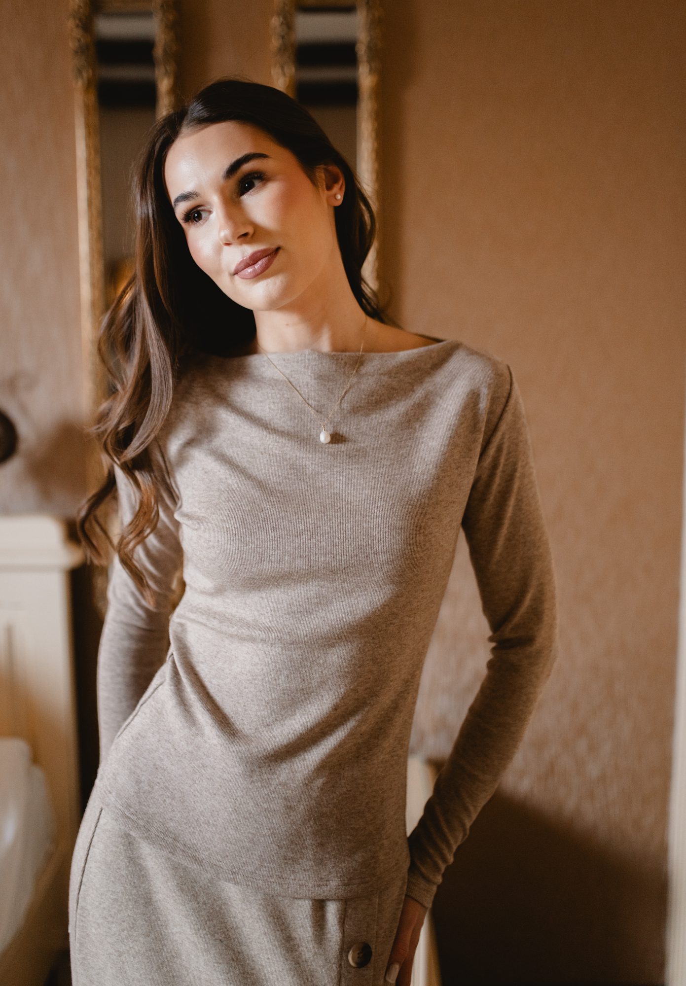 Sweter Estelle Melange Brown – kobiecy sweterek z dekoltem „w wodę”
