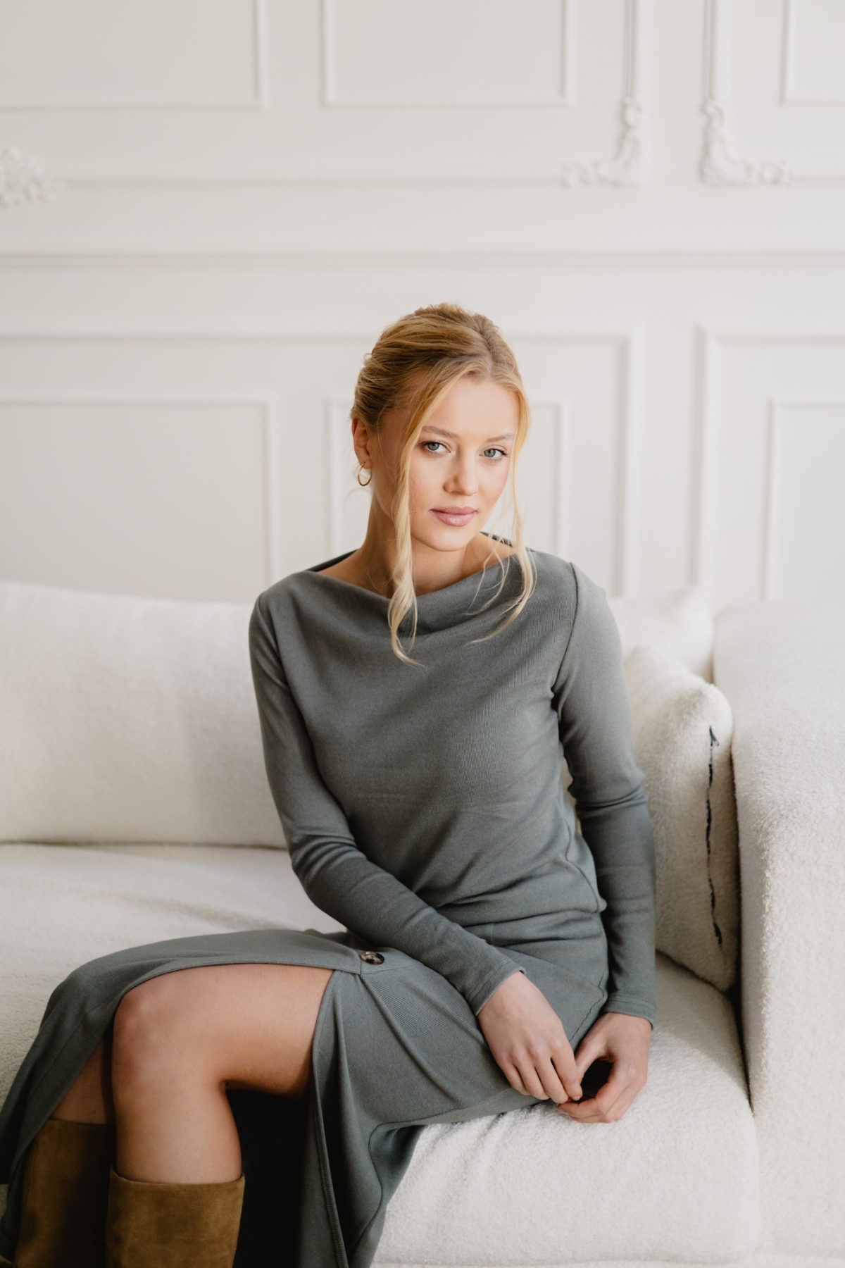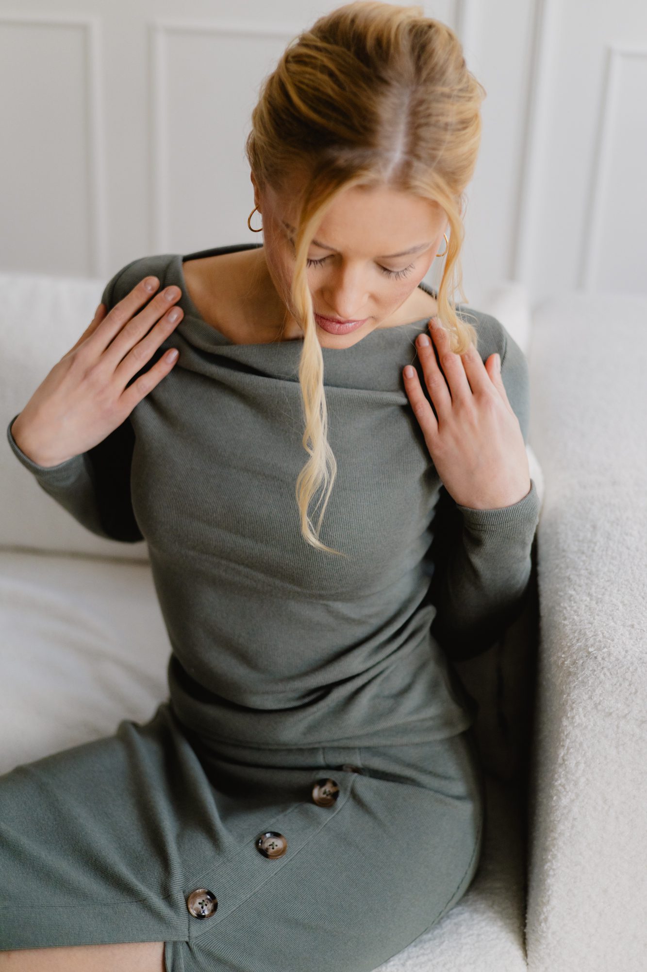Sweter Estelle Olive Green – kobiecy sweterek z dekoltem „w wodę”