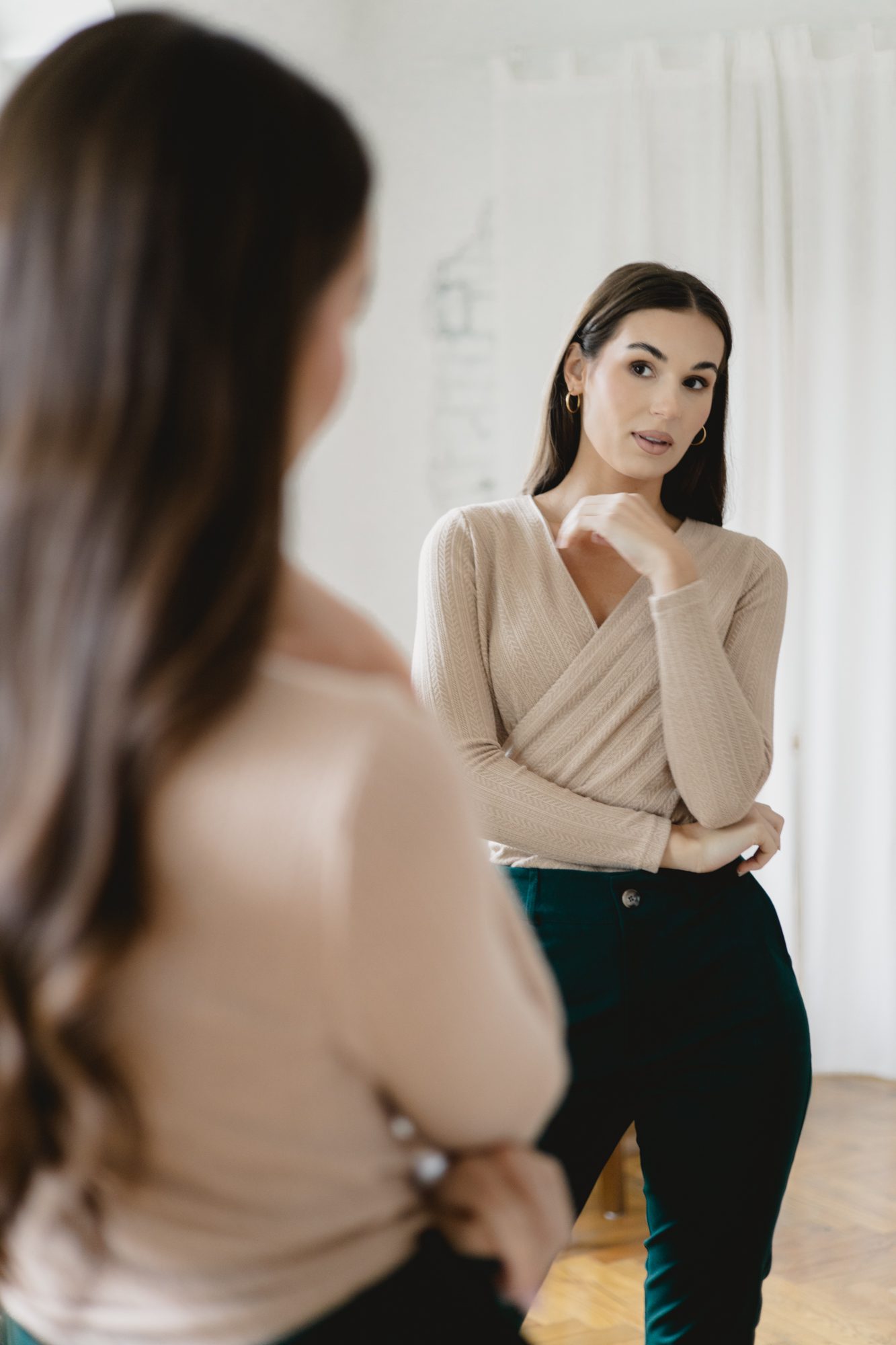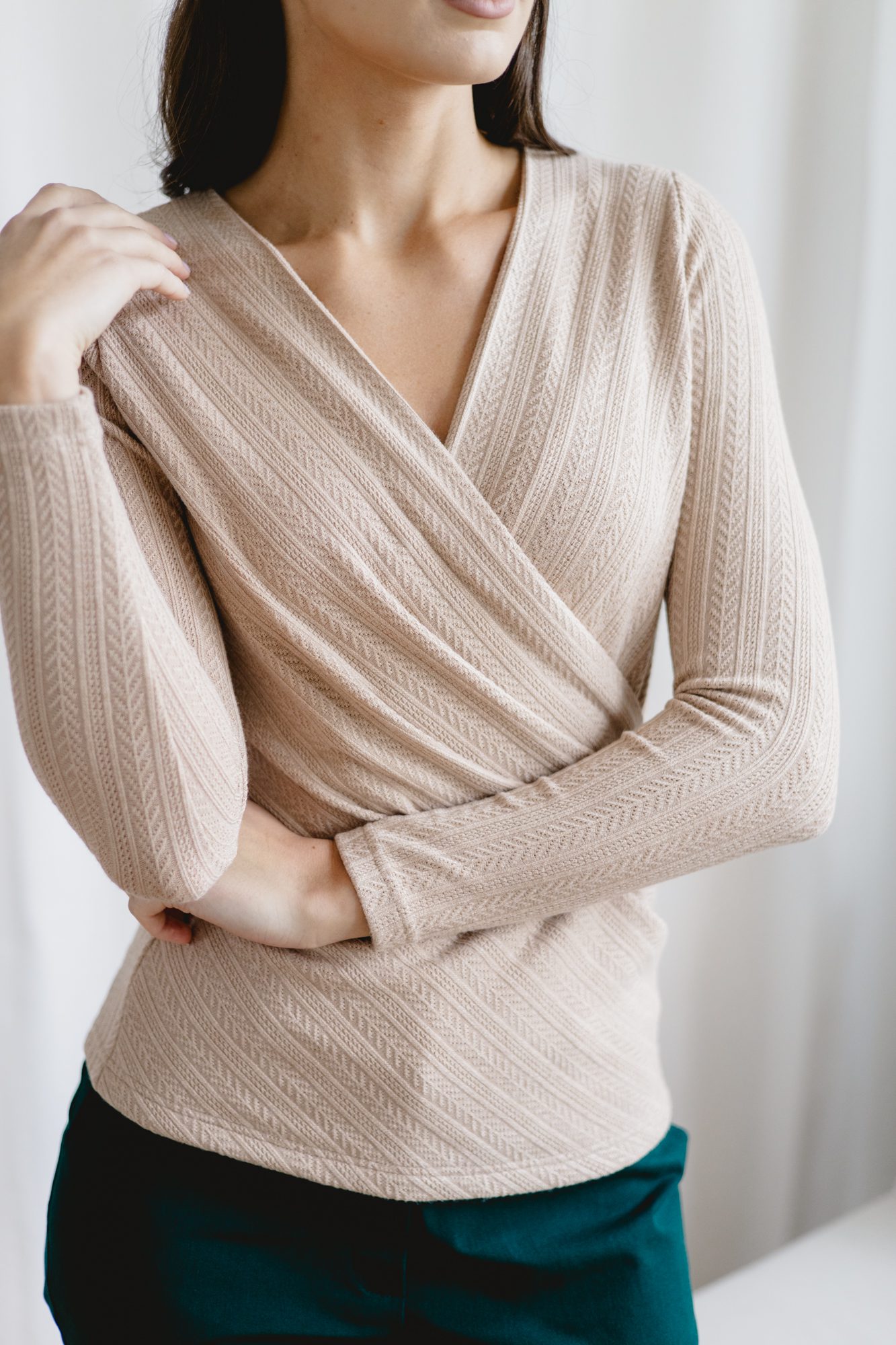 Melanie sweater uszyliśmy z przemiłej w dotyku dzianiny swetrowej. Bluzka jest elastyczna i idealnie dopasowuje się do ciała. Świetnie wygląda zarówno „wpuszczona” w spodnie lub spódnicę, jak i noszona „na wierzchu”. Posiada zakładki w okolicy talii, które efektownie podkreślają wcięcie, jednocześnie maskując niedoskonałości. Dekolt kopertowy subtelnie podkreśla biust, w razie potrzeby umożliwi karmienie piersią.